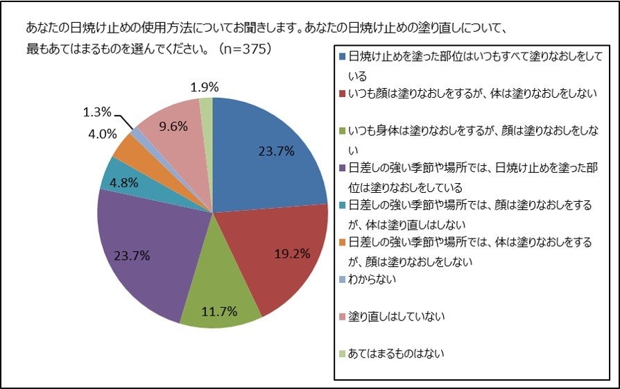 日焼け止めを使用している女性375名に、日焼け止めの塗り直しについて聞きました。「日焼け止めを塗った部位はいつも塗りなおしをしている」23.7%、「顔だけ塗りなおしている」19.2%、「身体だけ塗りなおしている」11.7%、「日差しの強い季節や場所では塗り直しをしている」23.7%で、「塗り直しはしていない」が9.6%のみであることから、日焼け止めの塗り直しの習慣は一般的に広がってきているようです。