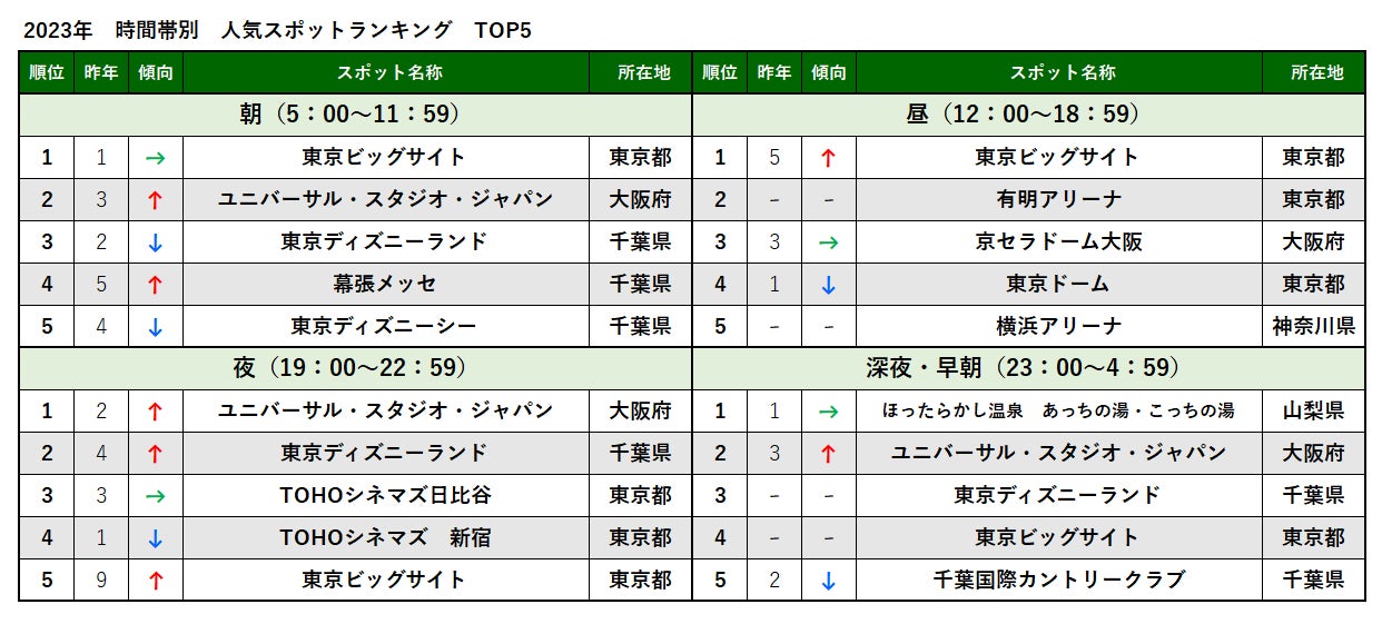 昨年同様、朝時間帯は遊園地/テーマパーク、昼時間帯にはイベントホール/公会堂、夜時間帯は映画館に分類される施設が多くランクインしています。一方、深夜・早朝時間帯は、例年だとゴルフ場が多くランクインしていますが、2023年は遊園地/テーマパークやイベントホール/公会堂などが上位にランクインしており、テーマパークの開園直後、あるいは早朝から開催されるイベントの開場にあわせた移動傾向がうかがえます。