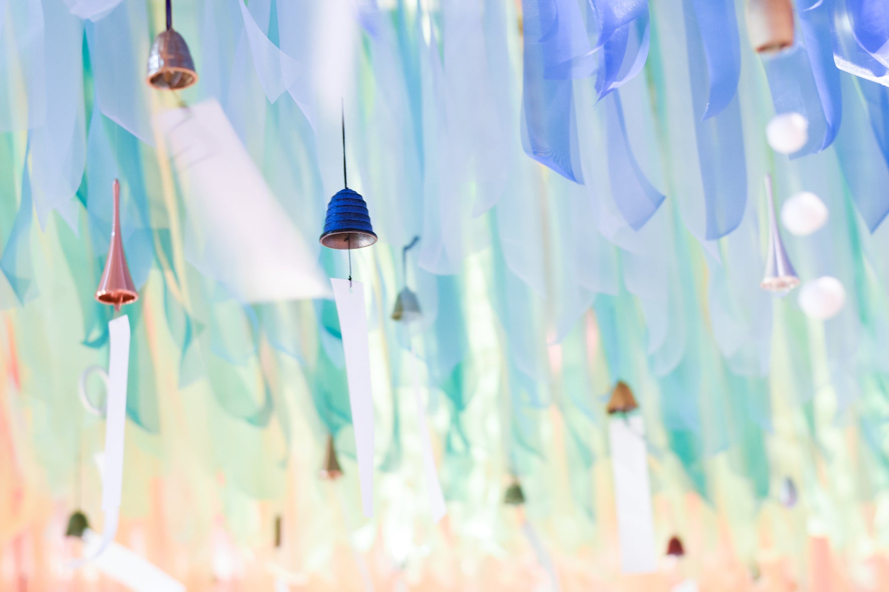 東京ミッドタウンの館内には、視覚と聴覚で日本らしい“涼”を体感できる風鈴インスタレーションが登場。風鈴の優しい音色と、ゆらゆらと揺れるリボンが涼しさを演出。また入道雲が映える青空、ピンク色に染まる夕焼けなど様々な表情をみせる夏空をイメージした色とりどりのリボンが風鈴を彩り、フォトジェニックな空間としても展開します。
