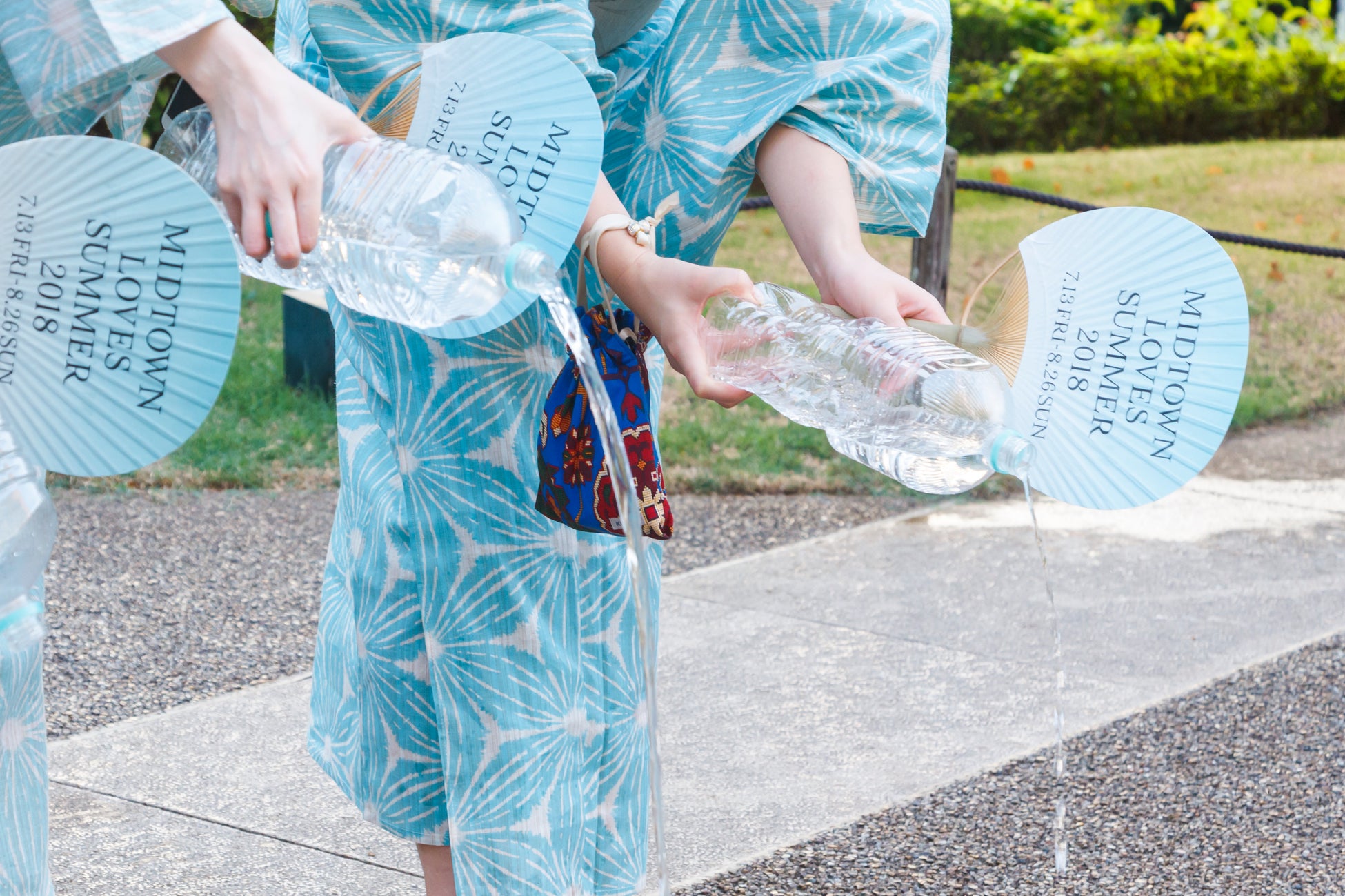 庭や道路に水を撒いて涼をとる、日本の昔ながらの風習である「打ち水」を今年も“大暑の日”に開催!地域の皆様と一緒に、ヒートアイランド対策に取り組みます。打ち水には、東京ミッドタウンの地下貯水(雨水、井戸水等)を使用し、参加者にご持参いただいたペットボトルに入れて行います。街をあげてエコロジカルライフを目指す “都会の打ち水”、浴衣を着てぜひお気軽にご参加ください。