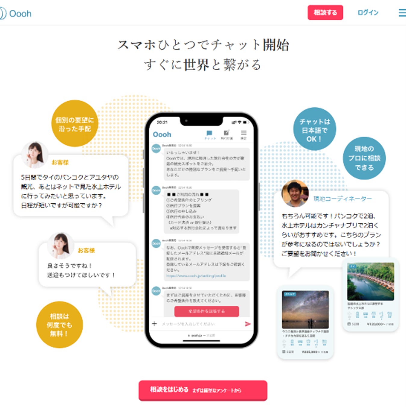 Oooh株式会社は、知識、経験のある人に直接聞くことが、より早く正しい情報に行き着く最適な手段と考え、海外旅行において現地旅行会社に直接相談・一括手配を可能にするチャットサービス「Oooh」を提供しています。