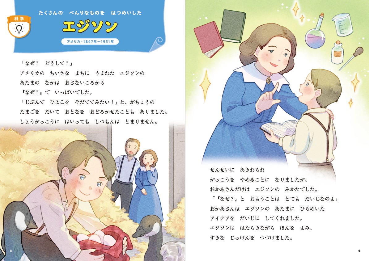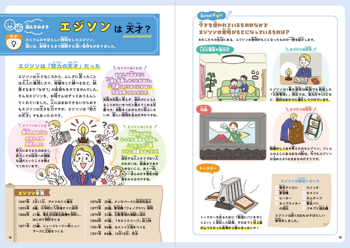 各話の後には、その人物が「何をした人か」「今の生活にどんな影響を与えているか」を紹介した図解ページ付き。物語を楽しみながら、偉人の功績を親子で学べる構成になっており、好奇心や学びの芽を自然と育てます。職業への関心や、将来の夢を育てる「はじめの一歩」に最適です。