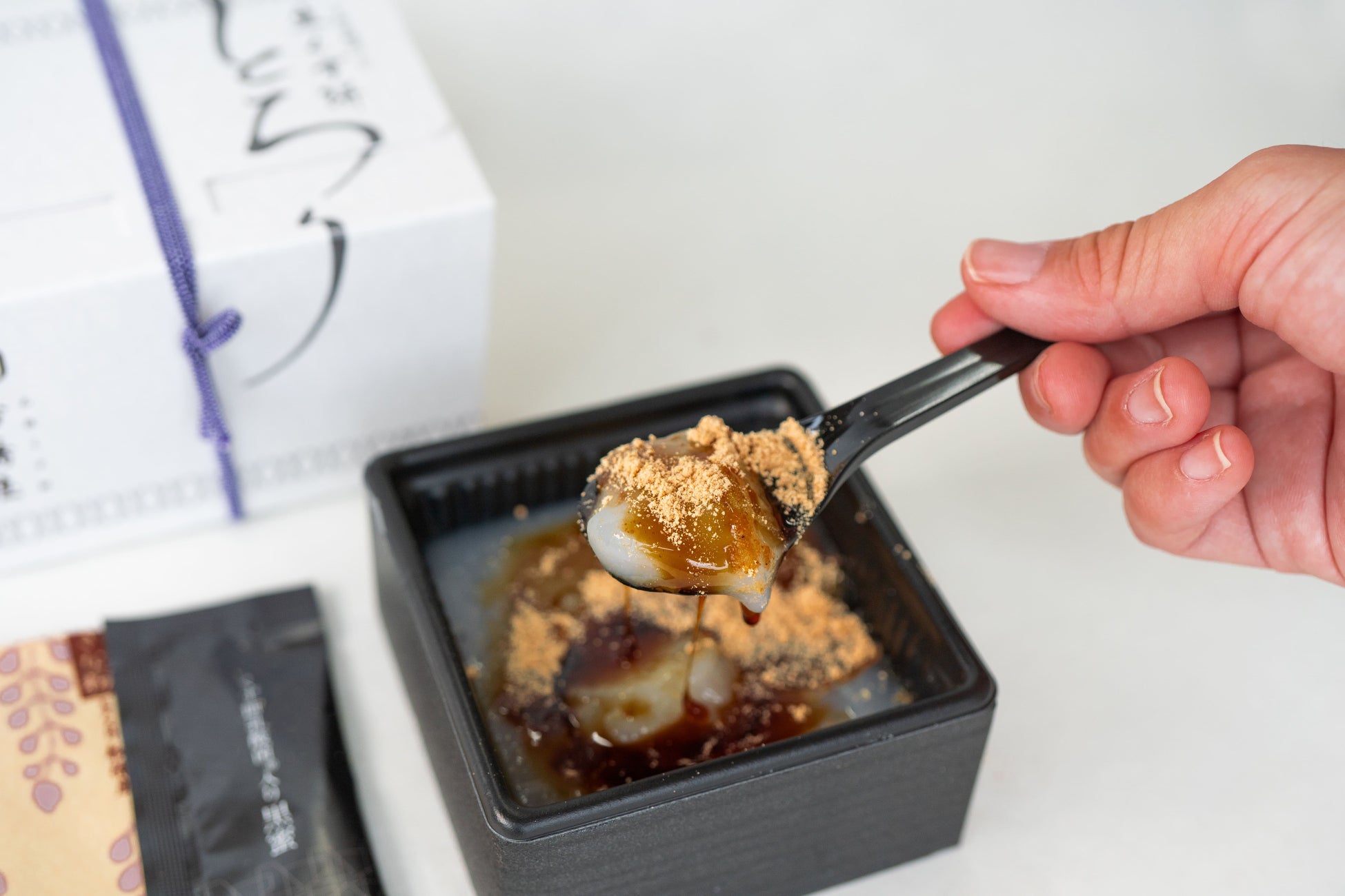 くず餅の原料である小麦澱粉を使用した生食感のくず餅。グランスタ東京店オープンに合わせ、約1年かけて開発されました。くず餅は発酵小麦澱粉を蒸し上げて作るのに対し、「とろり」は発酵小麦澱粉に長時間熱を入れて練り上げ冷やし固めます。口に入れると溶けてしまうようなとろ~りとした生食感のため、「とろり」と名付けられました。付属の黒蜜はくず餅乳酸菌入りなので、身体へのやさしさが染み渡る新食感和スイーツです。開けるのがワクワクするような高級感のある箱・パッケージに仕上げました。