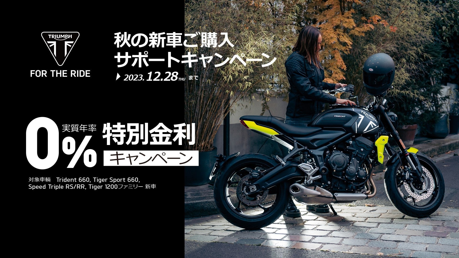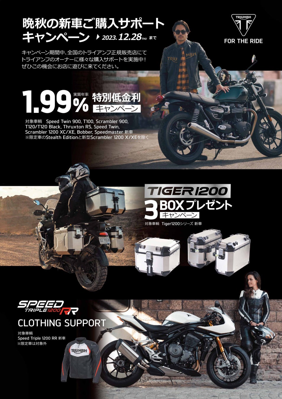 冬が始まる直前、トライアンフファンの方々へ懐が温まるお得なサポートとなっていますので、ぜひお近くの正規販売店に足をお運びいただき最新のトライアンフを直接ご覧ください。