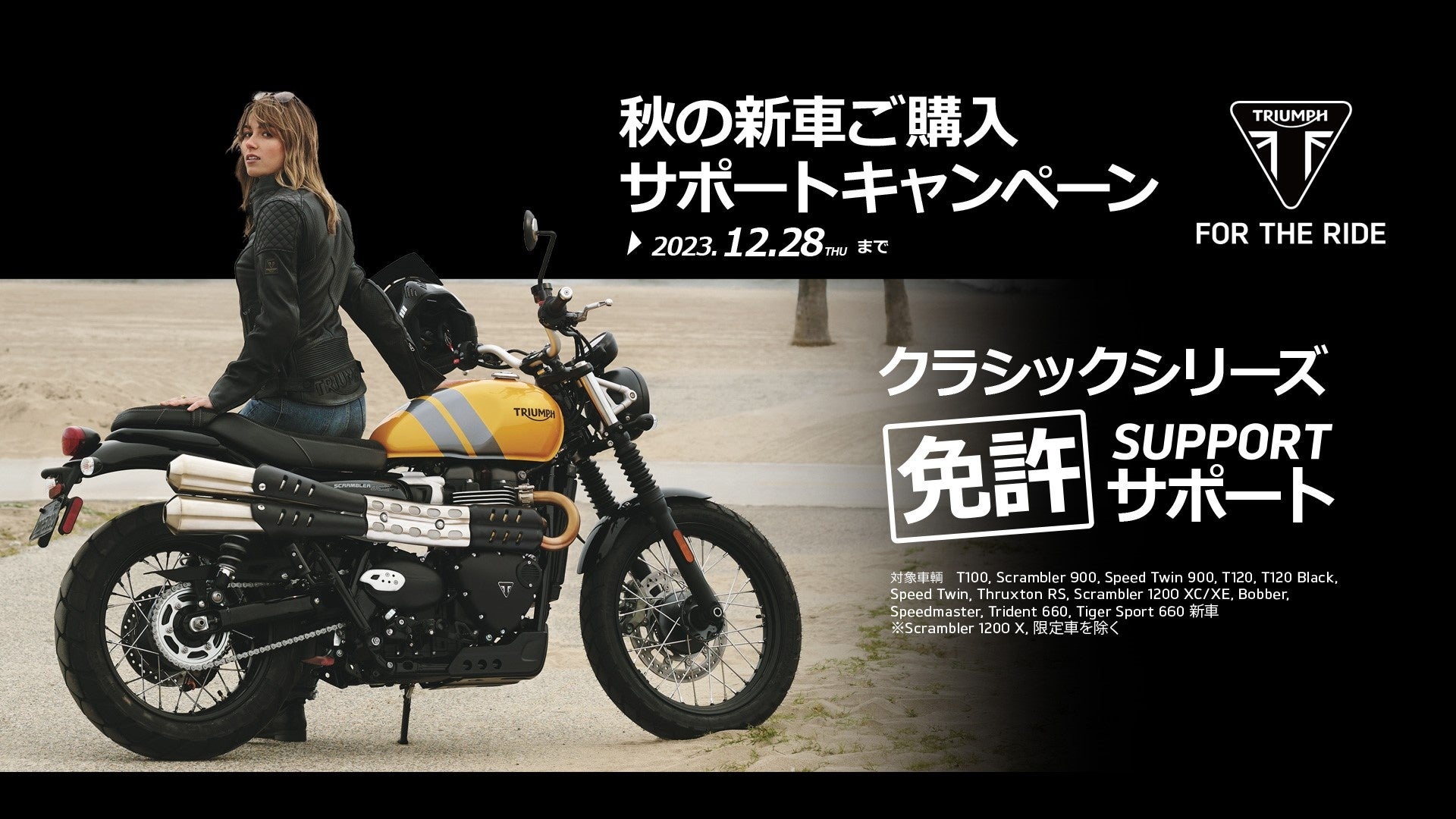 内容:キャンペーン期間中、全国のトライアンフ正規販売店にて対象車両をご成約・ご登録された方、且つ2023 年7月以降に大型自動二輪 MT 免許を取得された方、または 2024 年3月末までに取得される方を対象に、大型自動二輪MT 免許取得費用相当分としてそれぞれ