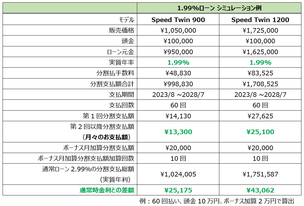 内容:キャンペーン期間中、全国のトライアンフ正規販売店にて対象車両をご成約、且つローン契約完了していただいたお客様に、「1.99% 特別低金利ローン」をご提供いたします。