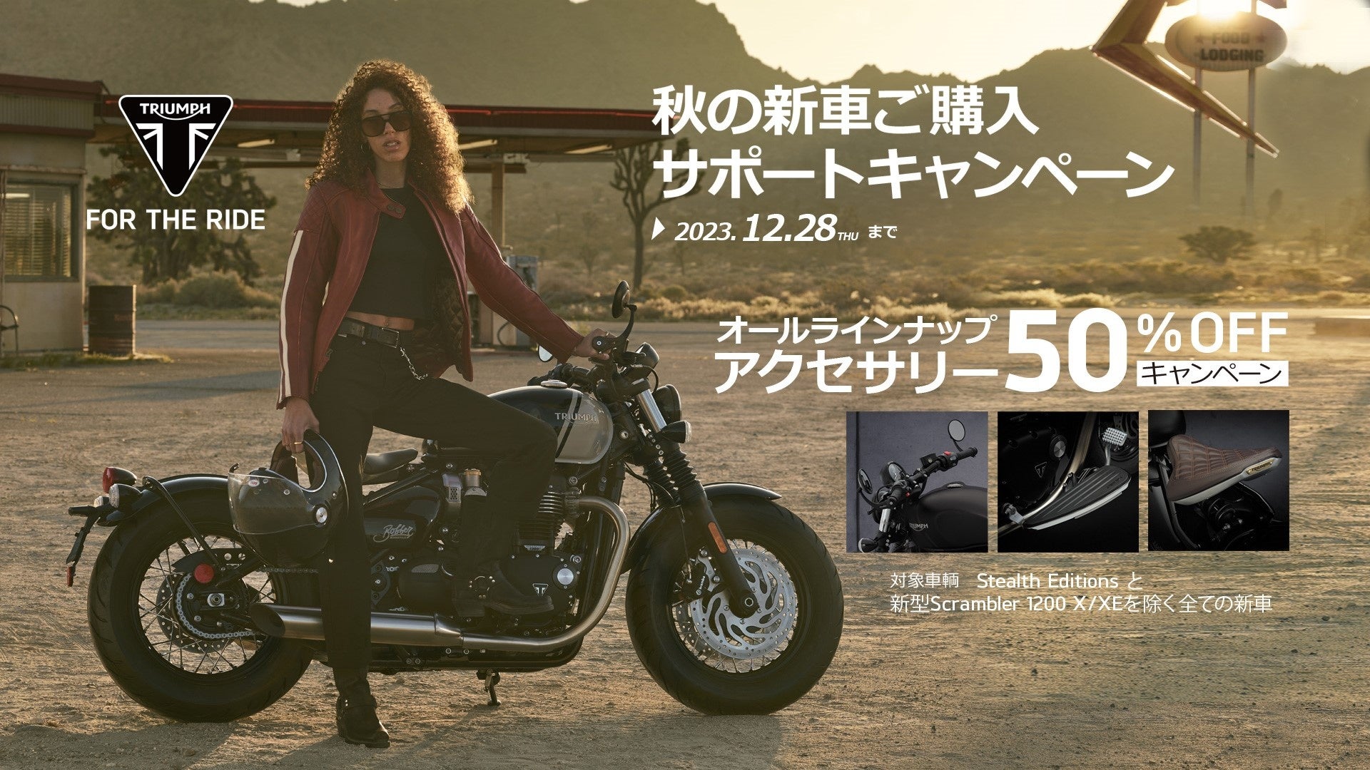 この秋、トライアンフが誇るオールラインナップの新車をご購入される方々への感謝の気持ちとして、トライアンフライダーが純正アクセサリーパーツを【50%OFF】にてご購入が可能となる、お得なキャンペーンです。