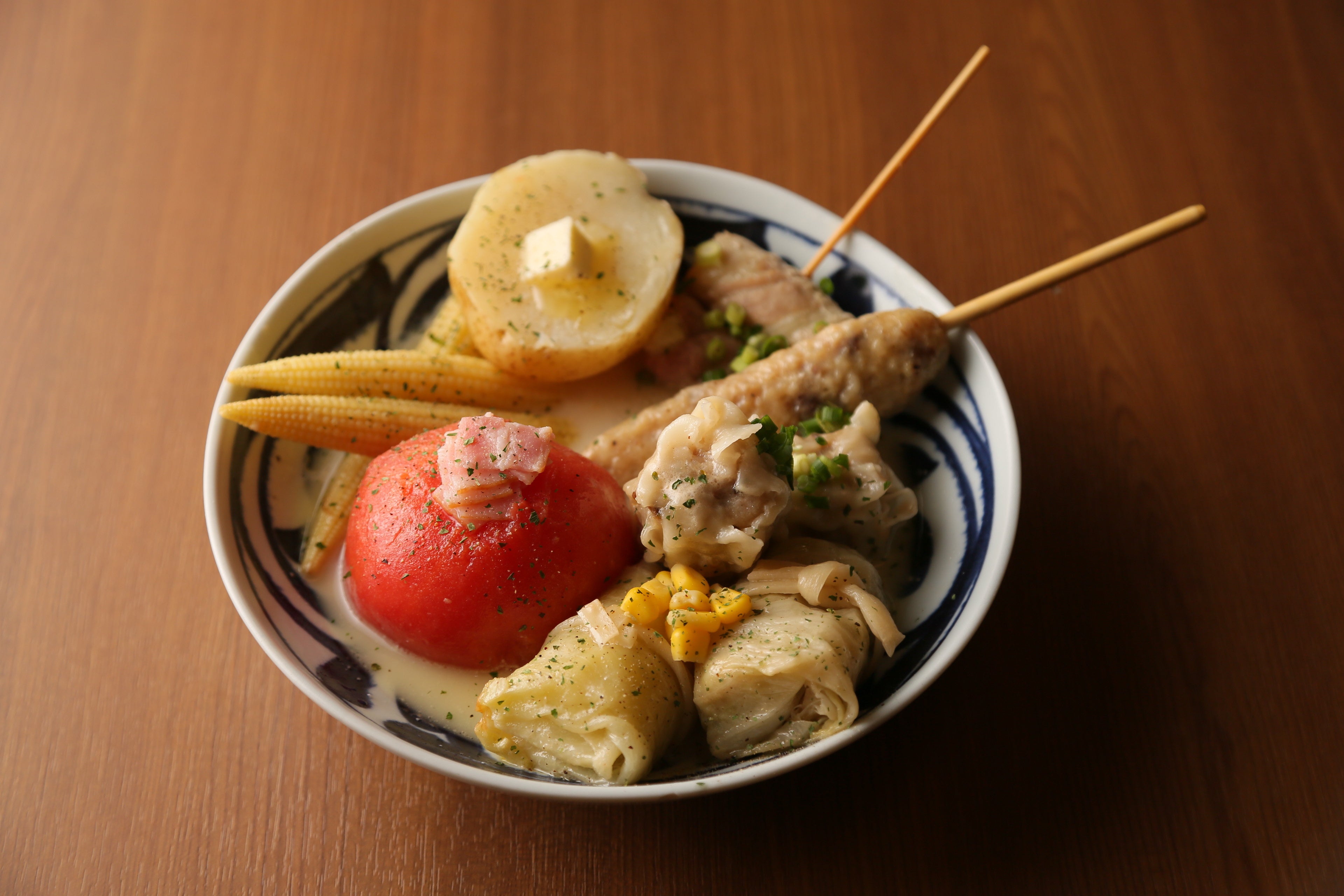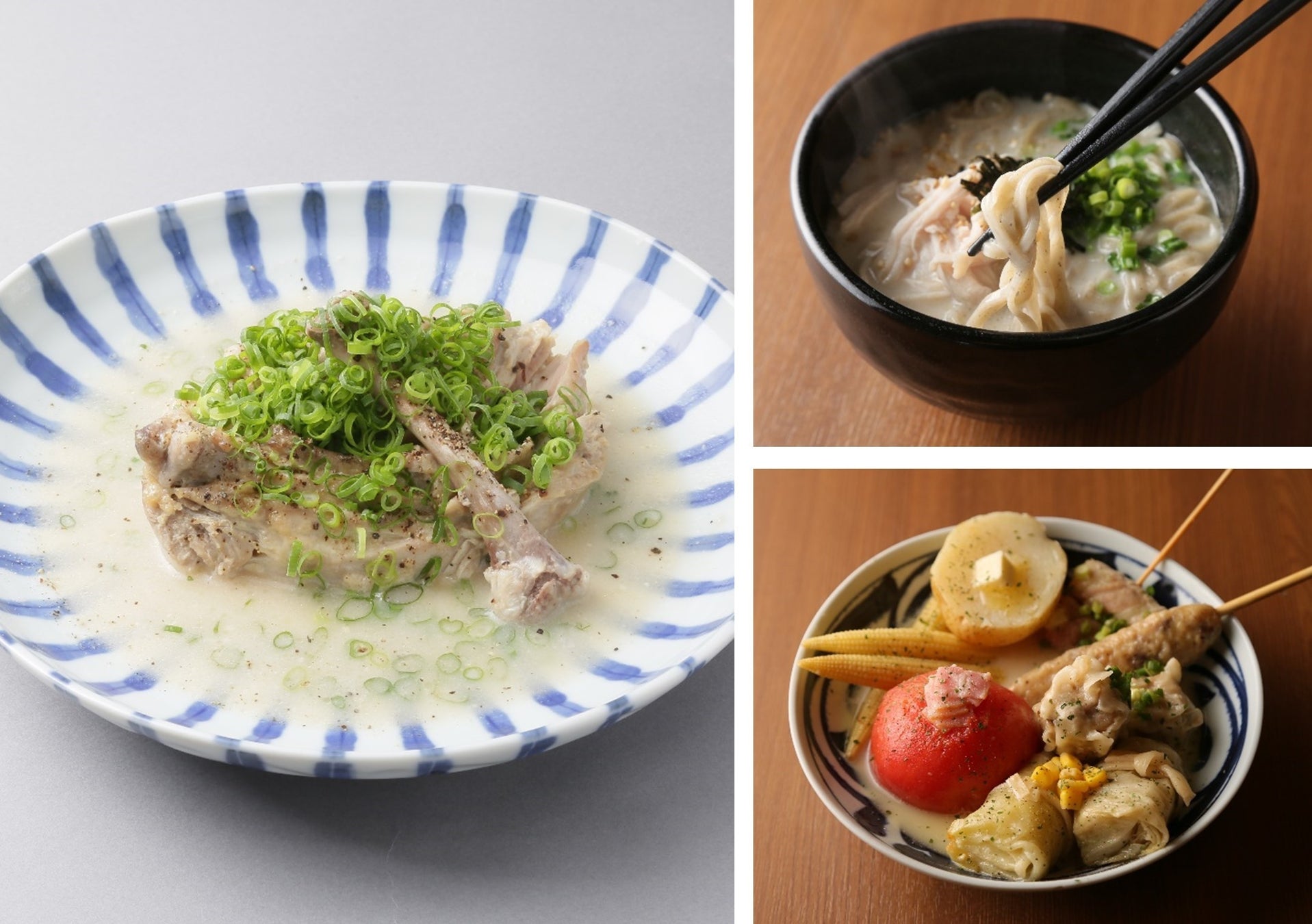 鶏の旨味が凝縮した白濁の濃厚 “鶏だしおでん” では、女性に人気のトマト、じゃがバターなどに合わせ、鶏もも肉を贅沢に1枚使用し、じっくり煮込んだホロホロ食感の 「骨付き鶏」 は、特におすすめの一品。鶏だしを使用した 「鶏そば」 や 「鶏だし飯」 は、〆にどうぞ。