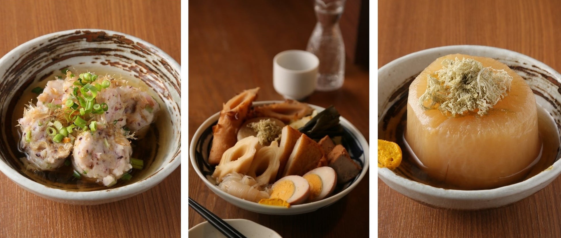 さっぱりとした味わいの中にも、風味豊かなあご出汁を使用した “あごだしおでん” は、大根やちくわ、こんにゃくなど定番食材に加え、マダコを贅沢に使用した手仕込みの 「蛸つみれ」 は、注文を受けてから出汁に入れてゆっくりと仕上げる、蛸の旨がたっぷり詰まった大人気の看板メニューです。また、自慢のあごだしを日本酒と割って味わう粋な 「出汁割」 も、ぜひご賞味ください。