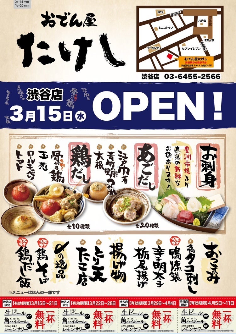 2種類の出汁で味わう 「創作おでん専門店」『おでん屋たけし 渋谷店』 3/15(水)オープン!