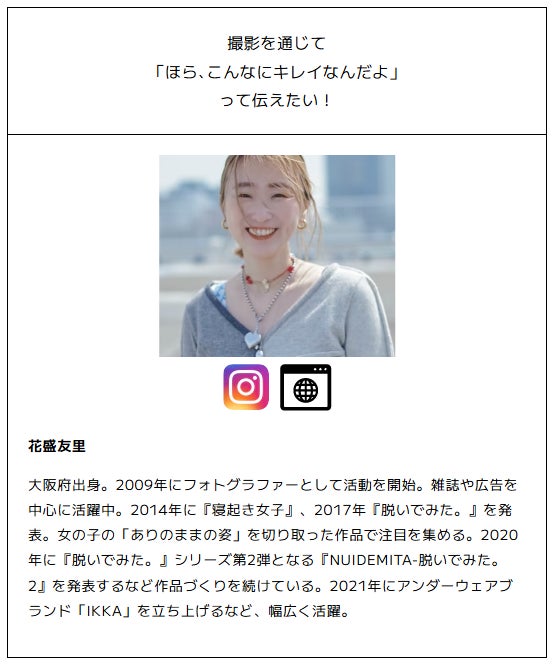 撮影は数々の女性誌の表紙なども手掛けられている、人気フォトグラファーの花盛友里さん。下着を通じて「自分をもっと好きになる」きっかけづくりをしたいというヘブンジャパンと、撮影を通じて「ほら、こんなにキレイなんだよ」と伝えたい花盛友里さんの想いが一致し、前回に引き続いたコラボレーションとなります。