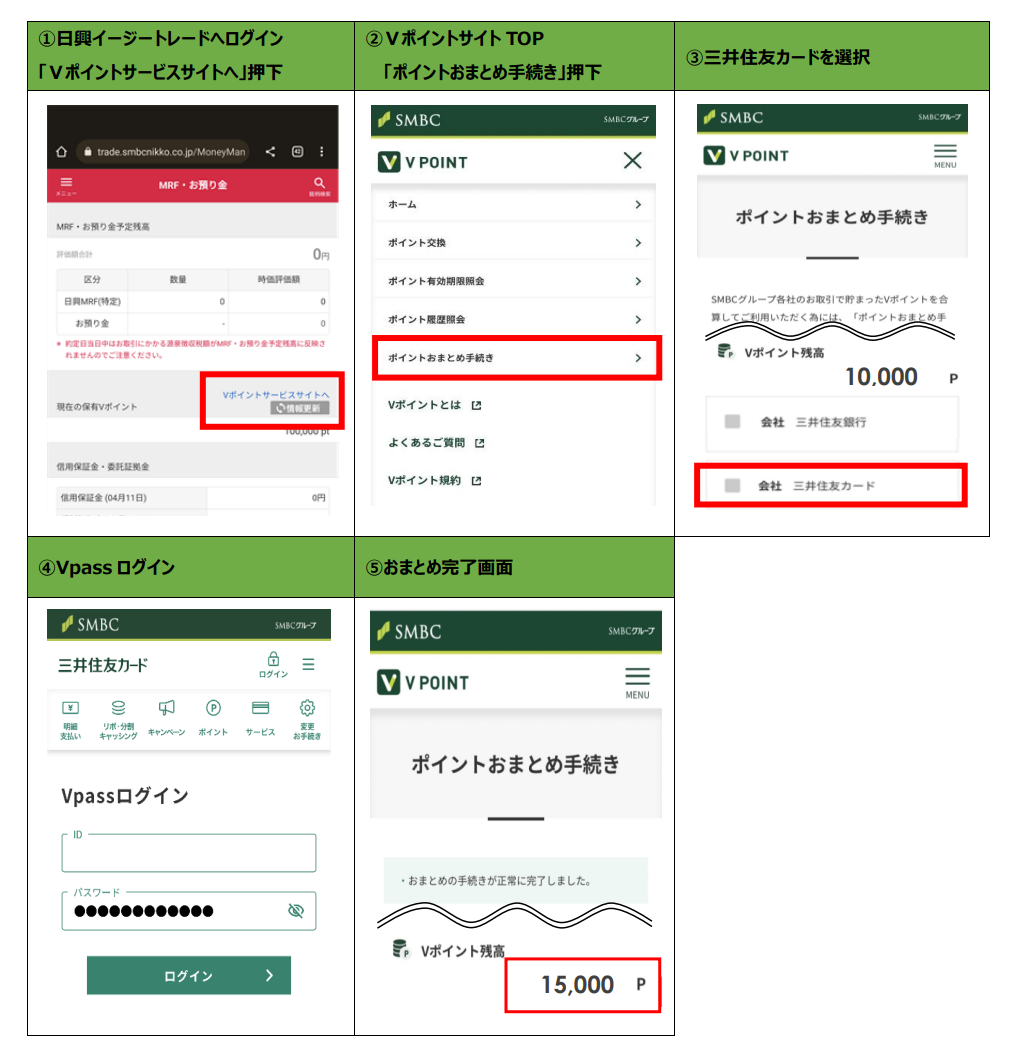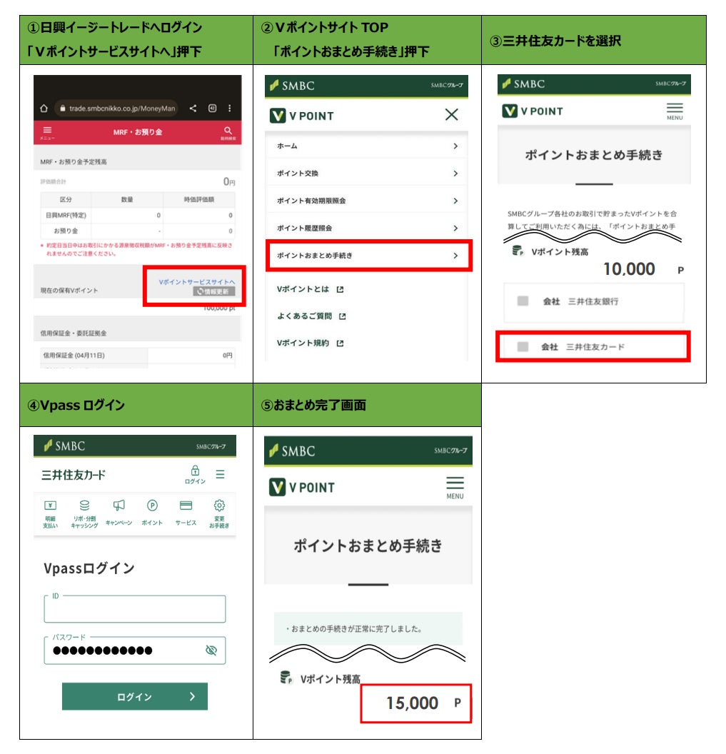 また、この度の導入により、SMBC日興証券のご利用で貯まったポイントは、既にVポイントを導入しているSMBCグループ各社で貯まったポイントと一緒に「ポイントおまとめ手続き」をすることで、合算して利用いただけるようになります。