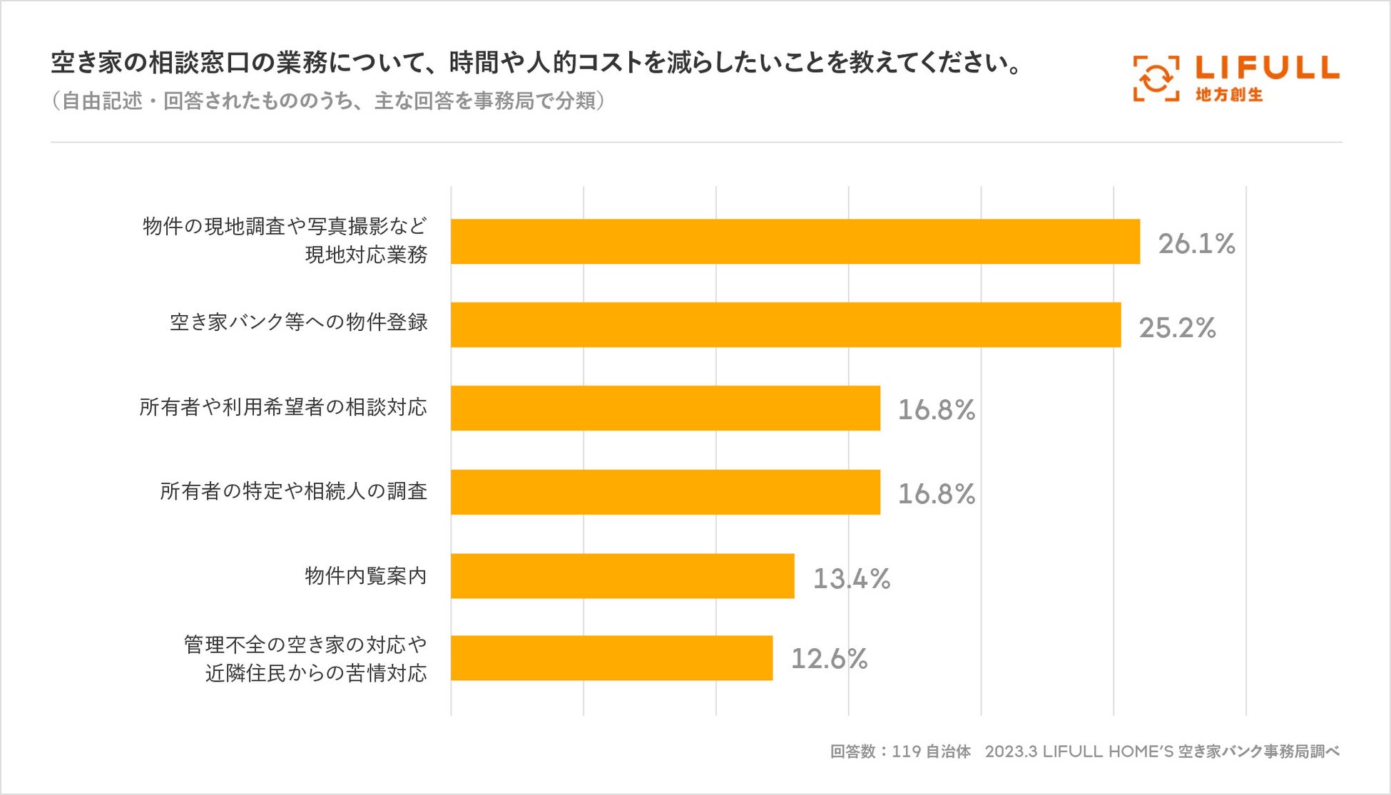 空き家の相談窓口の業務のうち、時間や人的コストを減らしたい業務内容について聞いたところ、「物件の現地調査や写真撮影などの現地対応業務」が26.1%と最も多く、僅差で「空き家バンク等への物件登録」(25.2%)が次点となりました。