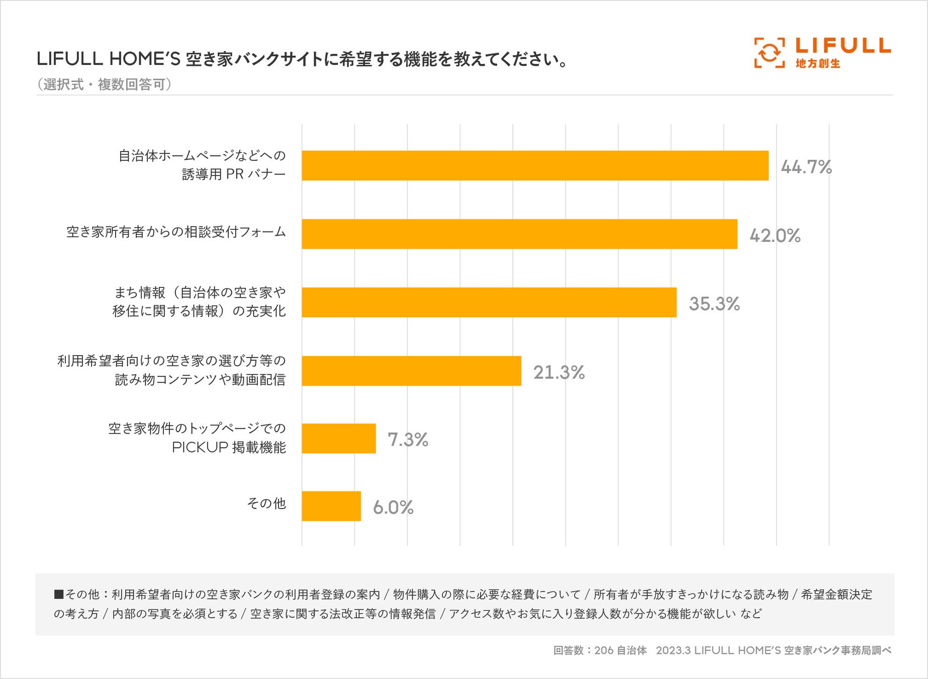 「LIFULL HOME'S空き家バンク」に期待する機能について聞いたところ、「自治体ホームページなどへの誘導用PRバナー」が最多の44.7%、次いで「空き家所有者からの相談受付フォーム」(42.0%)、「まち情報の充実化」(35.3%)という結果になりました。