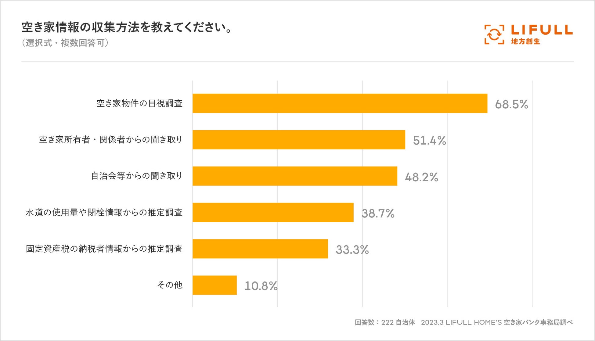 自治体が空き家情報をどのように収集しているか聞いたところ、最も多かったのは「空き家物件の目視調査」が68.5%でした。目視調査は人的・時間的コストがかかる方法ではあるものの、比較的間違いが少ない調査方法として、多くの自治体で実施されていることが分かります。次いで「空き家所有者や関係者からの聞き取り」(51.4%)、「自治会等からの聞き取り」(48.2%)が挙がりました。