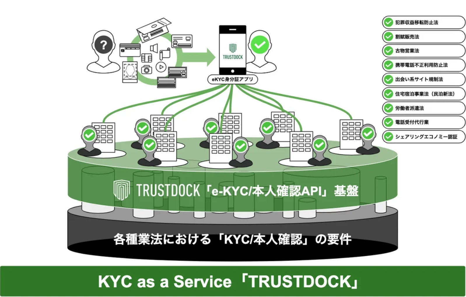 KYC as a Service「TRUSTDOCK」が提供している、デジタルIDウォレットとeKYC本人確認APIサービスでは、犯罪収益移転防止法をはじめ、携帯電話不正利用防止法、古物営業法、労働者派遣法、出会い系サイト規制法、民泊新法など、各種法律に準拠したKYCをAPI組み込みのみで実現します。