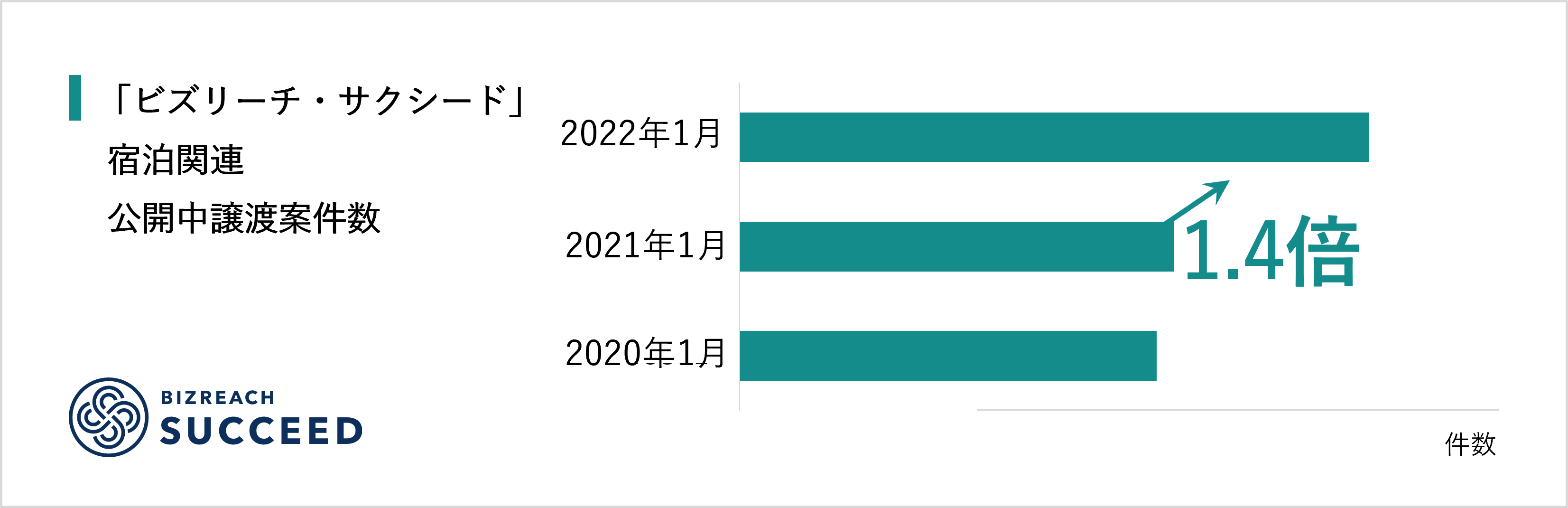 Visionalグループの株式会社M&Aサクシード(所在地:東京都渋谷区/代表取締役社長:金 蓮実)が運営する事業承継M&Aプラットフォーム「ビズリーチ・サクシード」(https://br-succeed.jp/)は、2022年1月に「ビズリーチ・サクシード」に公開されていた宿泊関連の譲渡案件数が174件で、前年同月比1.4倍、2020年同月比1.5倍であったことをお知らせします。また、「ビズリーチ・サクシード」で宿泊関連のM&Aを希望する企業は684社で、前年同月比1.2倍、2020年同月比1.3倍でした。