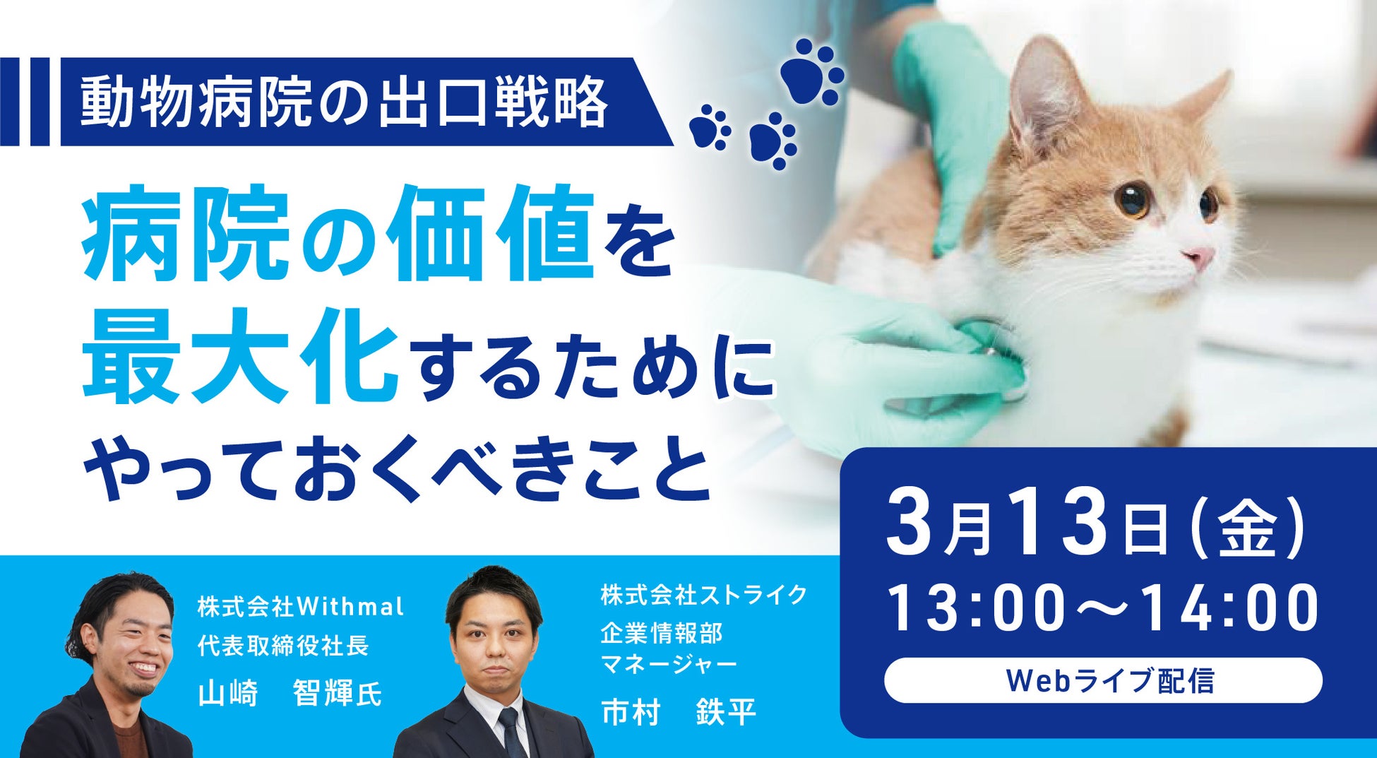 M&A仲介の株式会社ストライク(本社:東京都千代田区、代表取締役社長:荒井邦彦 以下「ストライク」)は、株式会社Withmal(ウィズマル)と共催で、動物病院の承継をテーマとしたオンラインセミナー「動物病院の出口戦略~病院の価値を最大化するためにやっておくべきこと~」を2026年3月13日(金)に開催します。