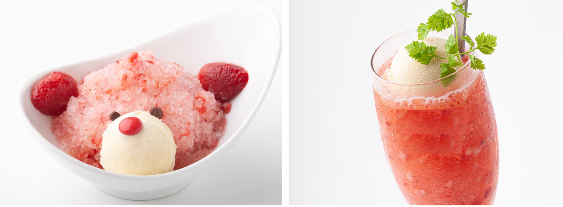 愛らしいくまさんの形をしたかき氷で、オリジナルの顔を作ってもらってお楽しみいただけます。ふわふわとした食感のいちごかき氷をベースに、いちごを耳として付けています。さらに、お客様の手でベビーチョコで目、マーブルチョコで鼻を付けることで、くまさんの可愛らしい表情が完成します。