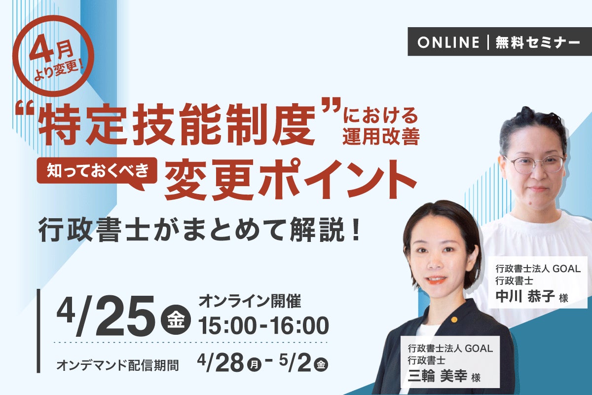 今回は、行政書士法人GOALの中川恭子様・三輪美幸様をお招きし、出入国在留管理庁の情報を整理した特定技能制度の変更点について、要点を解説します。