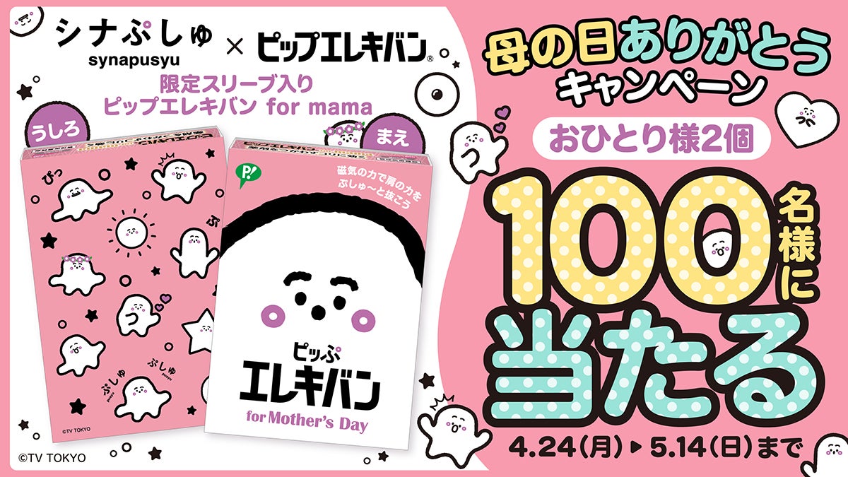 赤ちゃんの世界が「ぷしゅっ」と広がり、赤ちゃんを育てるすべての人の肩の力が「ぷしゅ~」と抜ける番組とし て、テレビ東京系列6局ネットにて平日あさ7:30から放送中の人気番組「シナぷしゅ」と、磁気の力で血行を改善しコ リをほぐす「ピップエレキバン」のコラボレーションが実現しました。「『母の日』に日々の感謝を込め、肩の力を抜いて癒されて欲しい」という想いでお届けするコラボキャンペーンです。