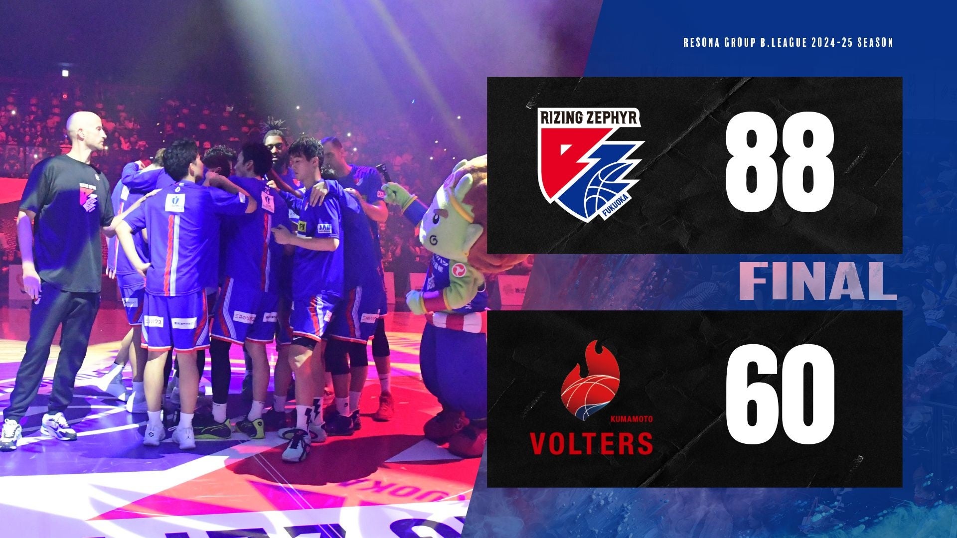 2024年10月13日(日)に開催されました、りそなグループBリーグ 2024-25【ライジングゼファーフクオカvs.熊本ヴォルターズ】において“福岡88-60熊本”の結果となりましたことお知らせいたします。