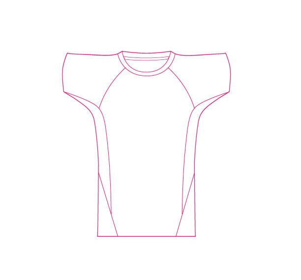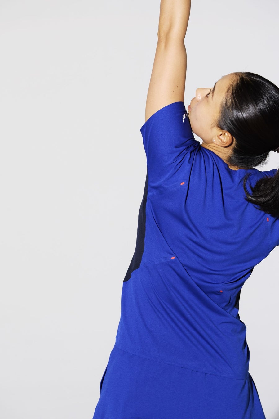 スポーツのさまざまな動作時に、衣服から受けるつっぱりなどのストレスがかかる箇所を研究した、独自理論をベースにしたパターンです。エールフォルム=翼を広げたような上向きの袖、背面一枚構造や肩甲骨下のダブルダーツにより、サーブやストローク時の腕の振りや前傾姿勢における、肩や脇といった肩甲骨まわりの生地のつっぱり感を軽減します。