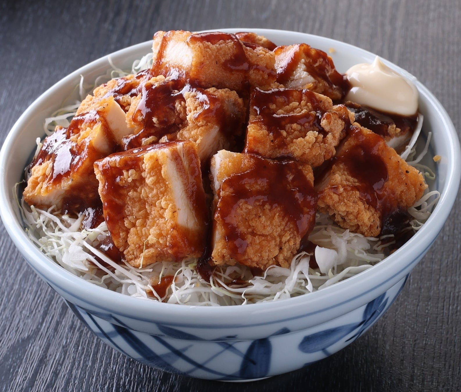 鶏むね肉をサクサク衣で仕上げた、ジューシーなフライドチキンに、ソースカツ丼でも使用している、どんまつオリジナルソースをたっぷりかけた、ボリュームたっぷりの丼ぶりです。