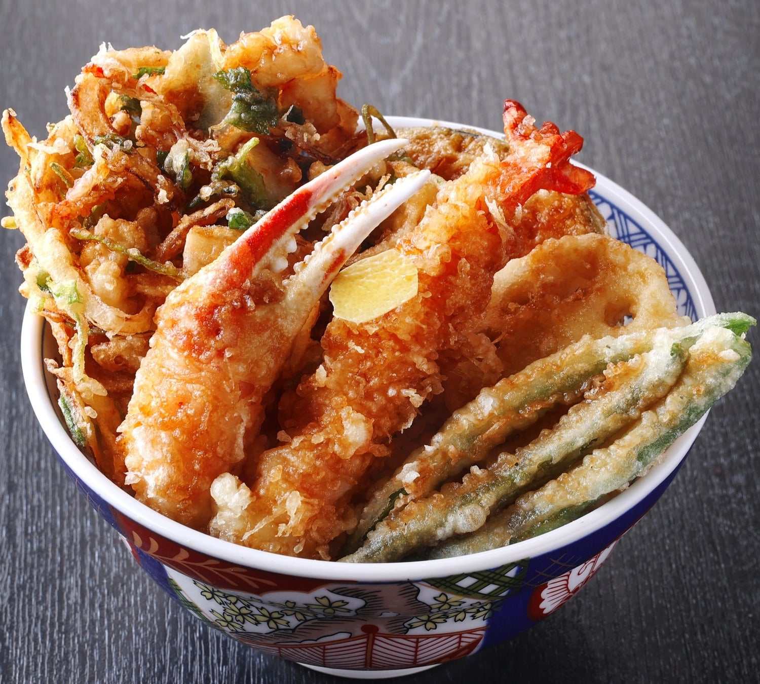 冬の味覚「かに」と「ほたて」を贅沢に合わせたかき揚げ、さらに海老とずわいがにの天ぷらを盛り合わせた、豪華な海の幸を存分に味わえる天丼です。