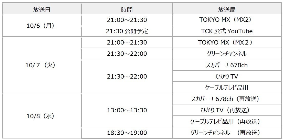 本番組は、10月6日(月)のTOKYO MX(MX2)を皮切りにジャパンダートクラシック当日(10/8)までスカパー!やグリーンチャンネルなどで放送されるほか、TCK公式YouTubeでも配信予定です。