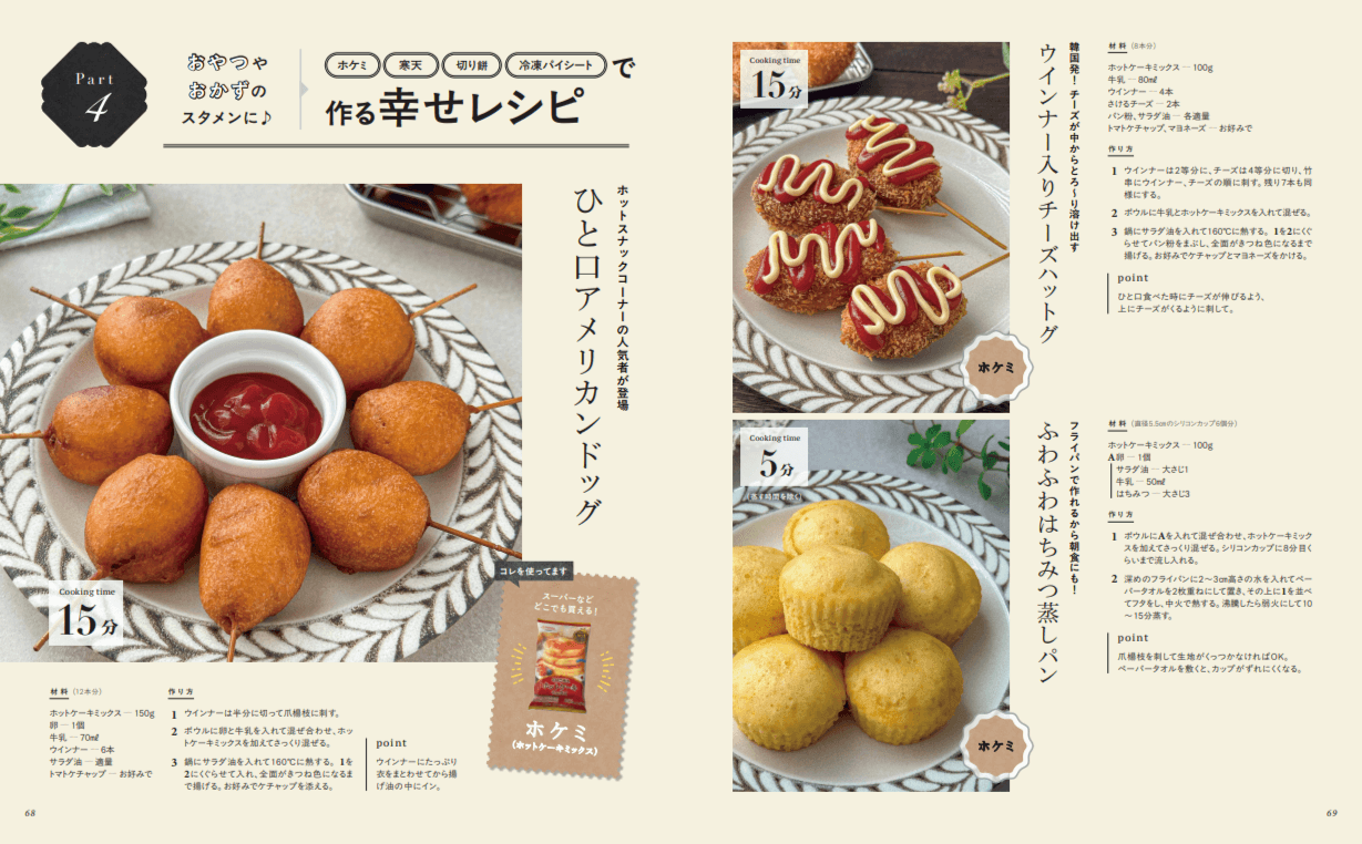 「おうちにある材料で、家族が喜ぶおやつやおかずを作りたい!」という願いを叶えるのがこのパートです。ホットケーキミックスや寒天、切り餅、冷凍パイシートといった身近な食材を活用したレシピが満載です。手作りとは思えない仕上がりに、家族も驚くこと間違いなしですよ。