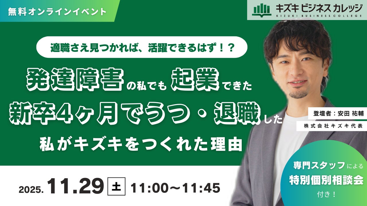就労移行支援事業所・キズキビジネスカレッジ(KBC)は、2025年11月29日(土)に、「うつ・発達障害経営者の仕事術:適職さえ見つかれば、活躍できるはず」をテーマとした無料オンライン講演を開催します。