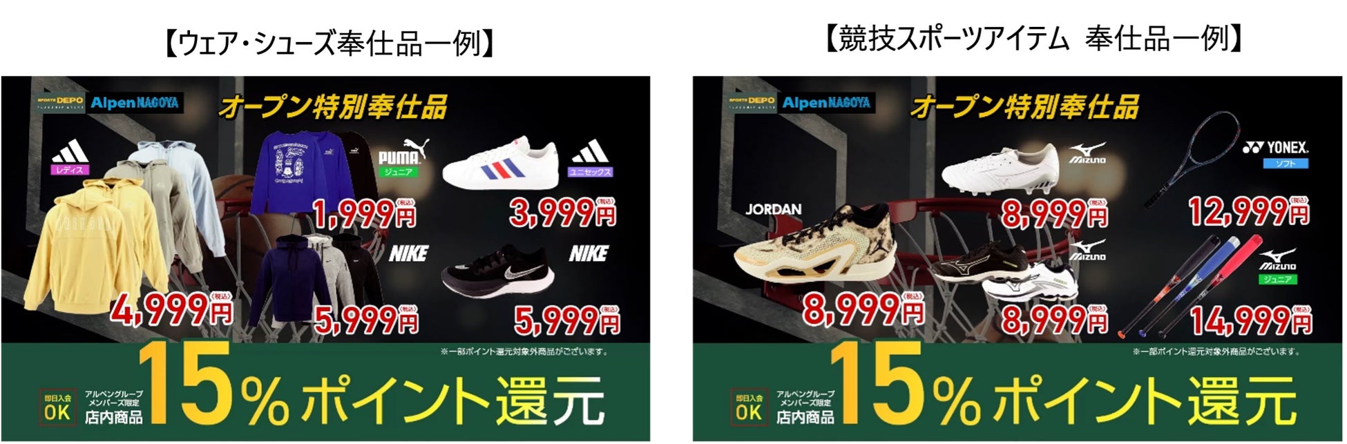 「Alpen NAGOYA」は、「スポーツをもっと身近に」というパーパスの実現に向け、スポーツの魅力を広め、スポーツが好きな人に寄り添う店舗づくりを目指してまいります。その一環として、旗艦店舗だからこそできる本格派プレイヤーを満足させられる品揃えは当然のこと、スポーツ用品をお手頃価格でご購入いただけるオープンならではの特別奉仕品も多数取り揃え、スポーツをより多くの方に楽しんでいただけるよう3月29日(金)から オープンセールを開催いたします。