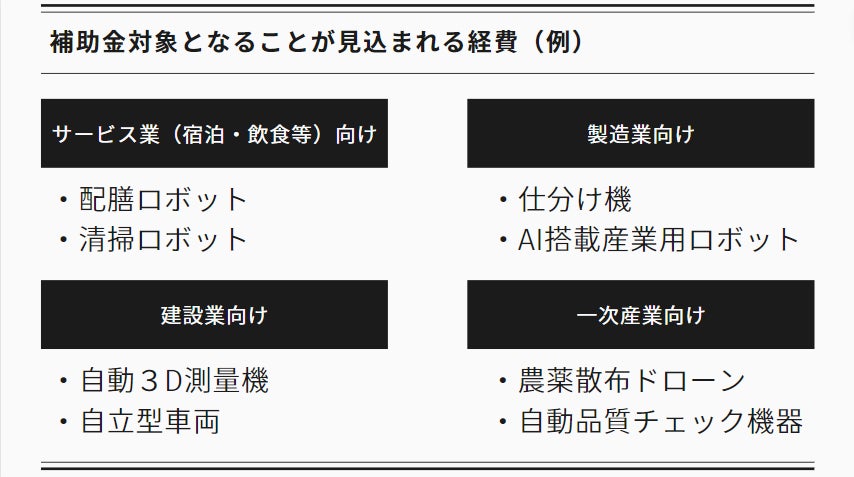 令和5年度補正予算の事業概要(PR資料)(経済産業省)によると、『IoT、ロボット等の人手不足解消に効果がある汎用製品を「カタログ」に掲載し、中小企業等が選択して導入できるようにする』とあります。