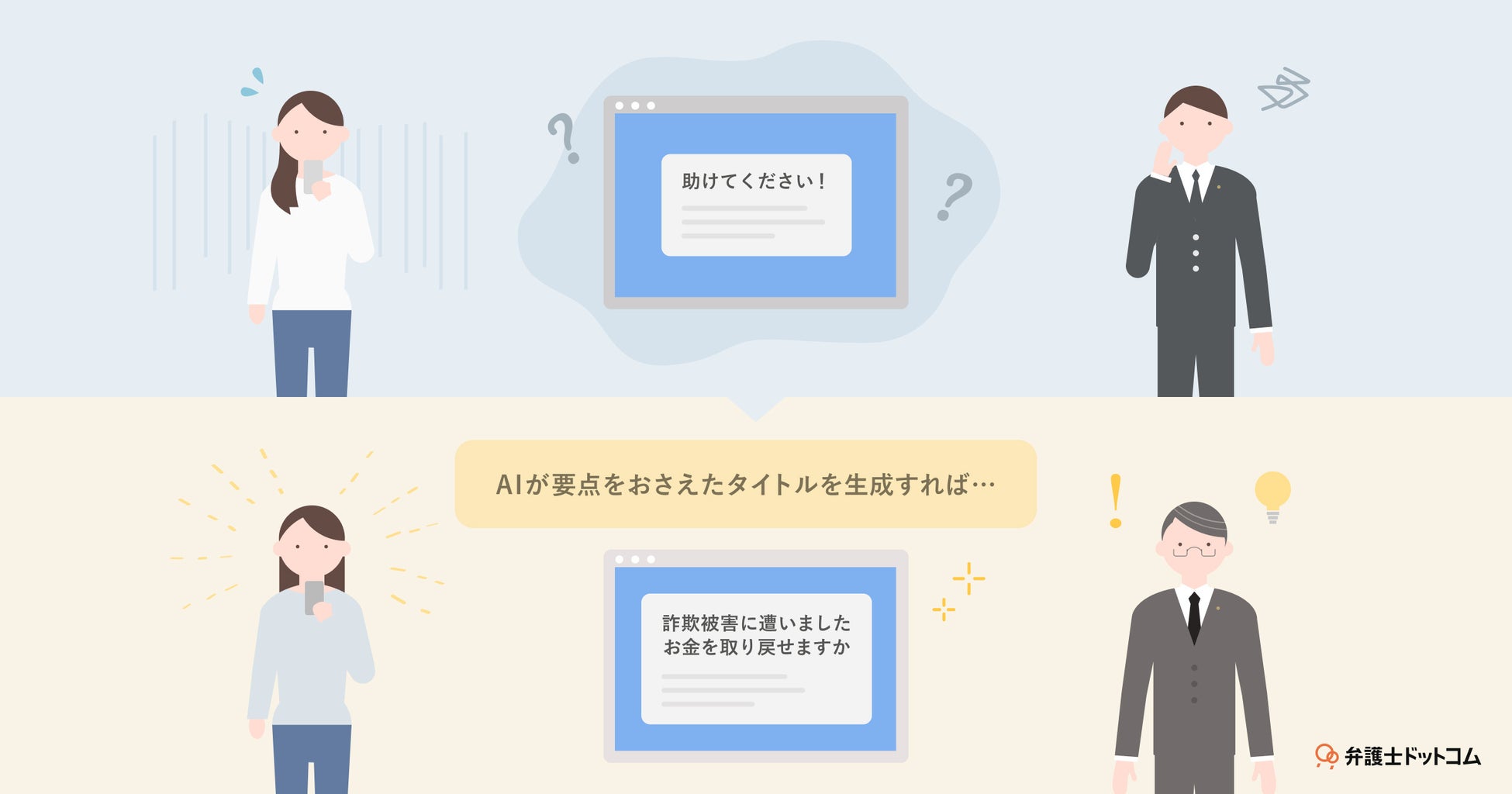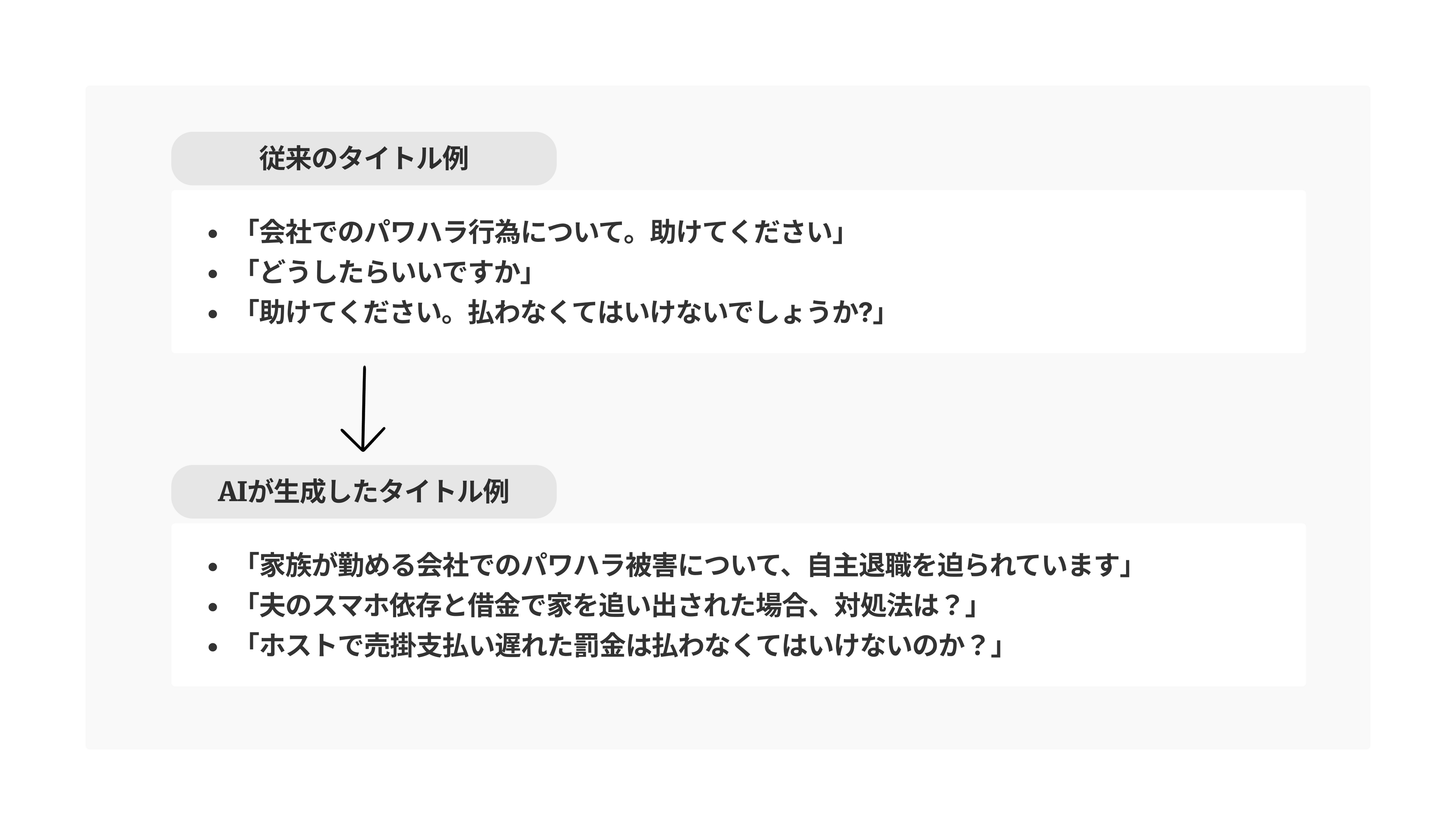『みんなの法律相談』は、ユーザーが自ら相談内容と相談のタイトルを投稿する必要があります。弁護士はその相談のタイトルをもとに、自身が回答可能な相談を選択していきます。ただ、法的知識がないユーザーにとって、弁護士がひと目で相談内容を推測できるタイトルをつけることは容易ではありません。そのため、「助けてください」のような非常に抽象度の高く不明確なタイトルがつけられ、結果として弁護士の回答も得られないというケースが見受けられていました。