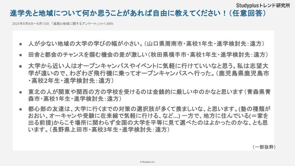 また、自由回答では「田舎と都会のチャンスをつかむ機会の差が激しい」(秋田県・高校1年生)や「東北の人が関東や関西の学校を受けるのは金銭的に厳しい」(青森県・高校1年生)といった声も寄せられています。