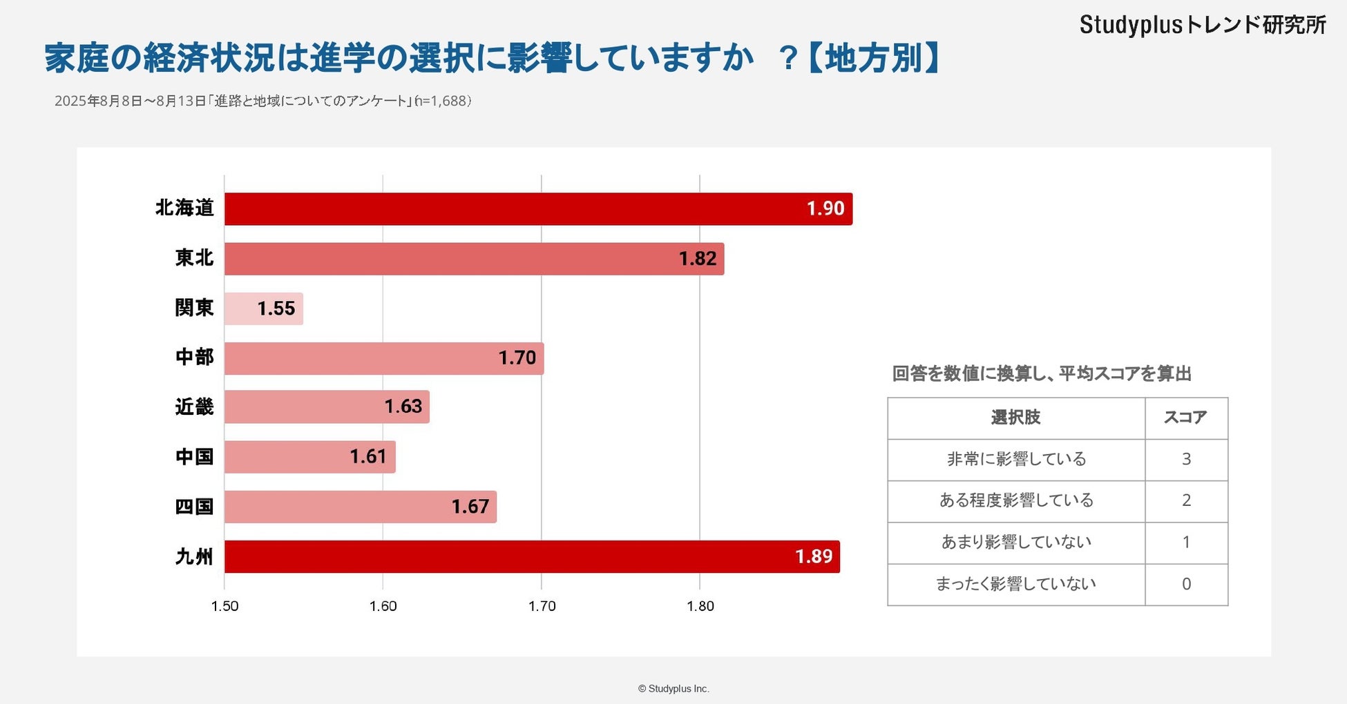 スタディプラスが2025年8月に実施したアンケート(「進路と地域に関するアンケート」対象:高校生1,703人)では北海道・東北・九州は関東や近畿と比べて「経済状況が進学に影響している」と考えていることが明らかになりました。