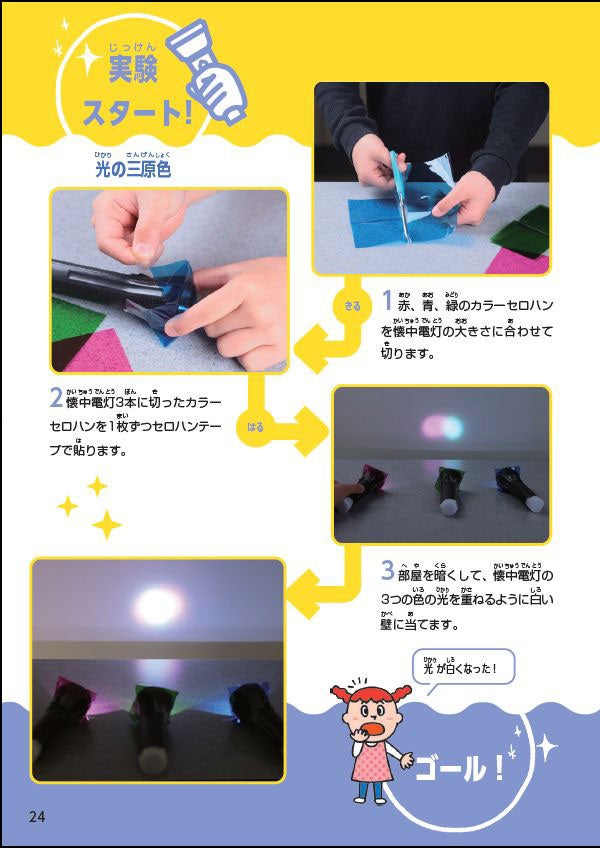 実験で扱う道具は、懐中電灯、セロハン、鏡など、100円ショップなどで揃う身近なものばかり。実際に体験することで子どもから「なぜ?」「どうして?」を引き出し、科学の入り口へ子どもをいざなうつくりになっています。