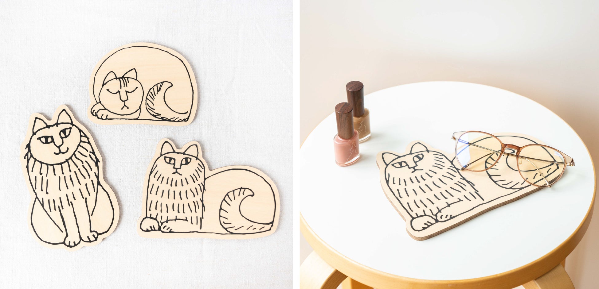 上質な白樺の木から作られている、スウェーデン・オプトデザイン製。こだわりの品質とデザインで、いいものを長く使うスウェーデンならではのものづくりへのこだわりが感じられます。ダイカットで表現されたスケッチねこたちと、木目のコンビネーションがナチュラルな雰囲気です。(特集ページより)