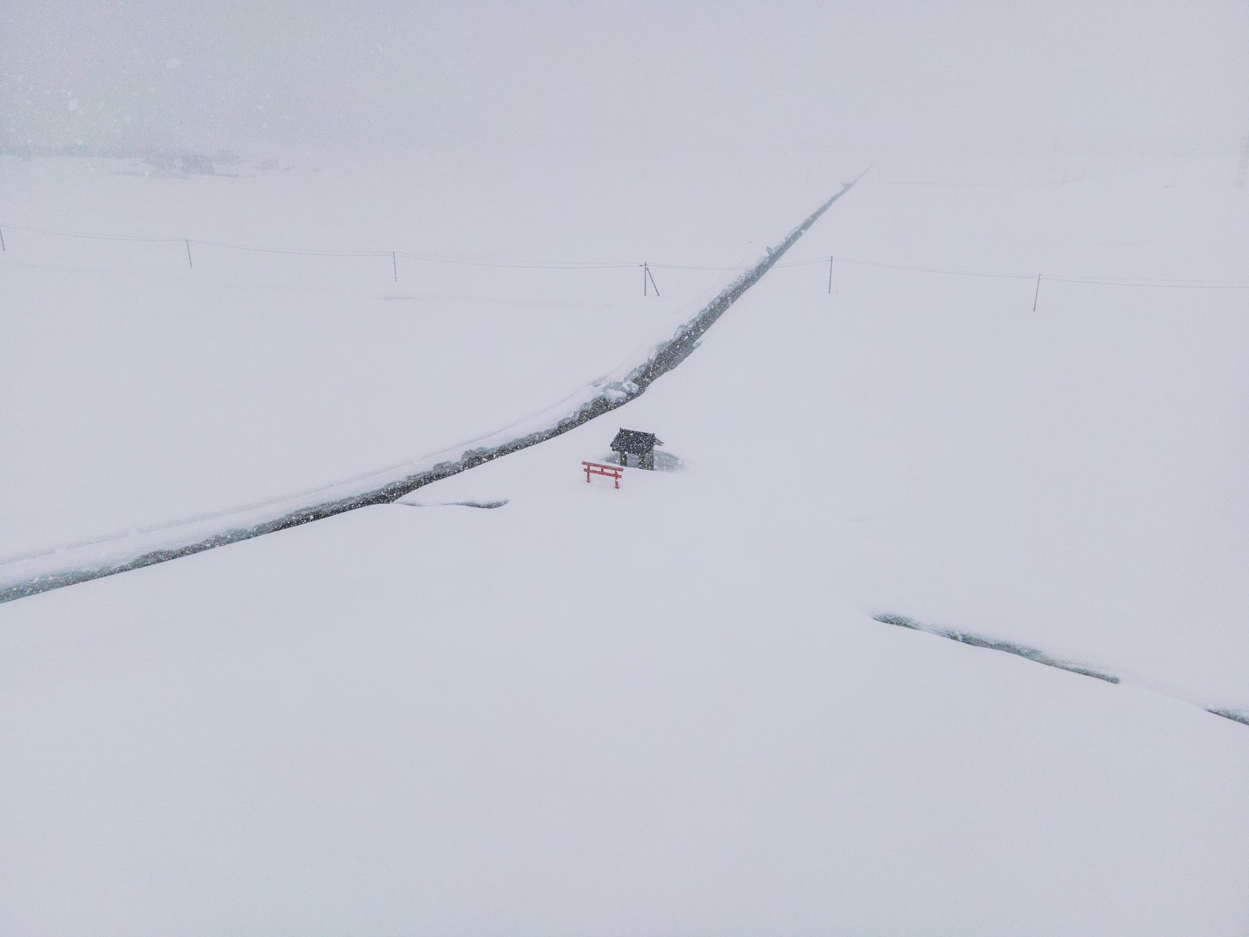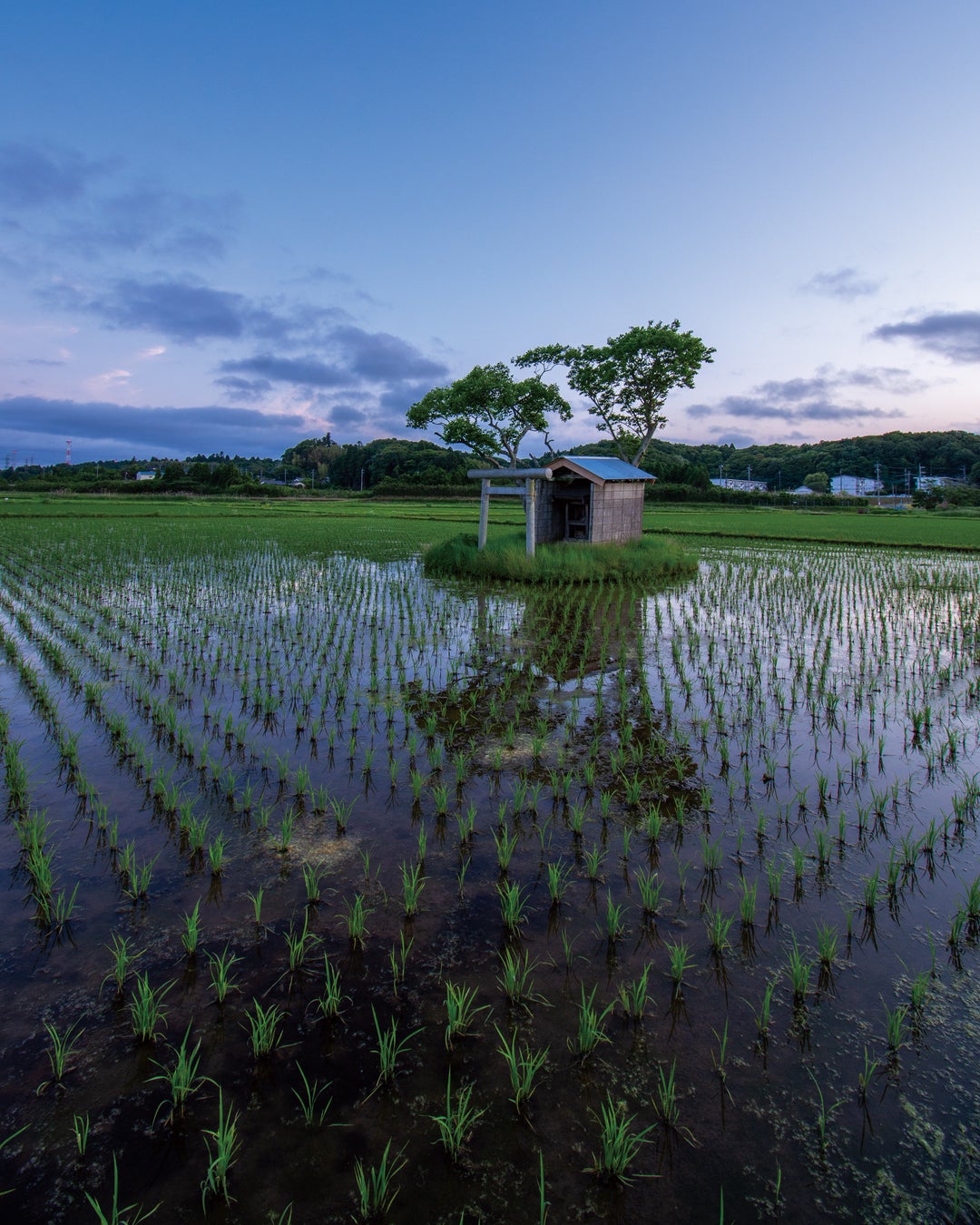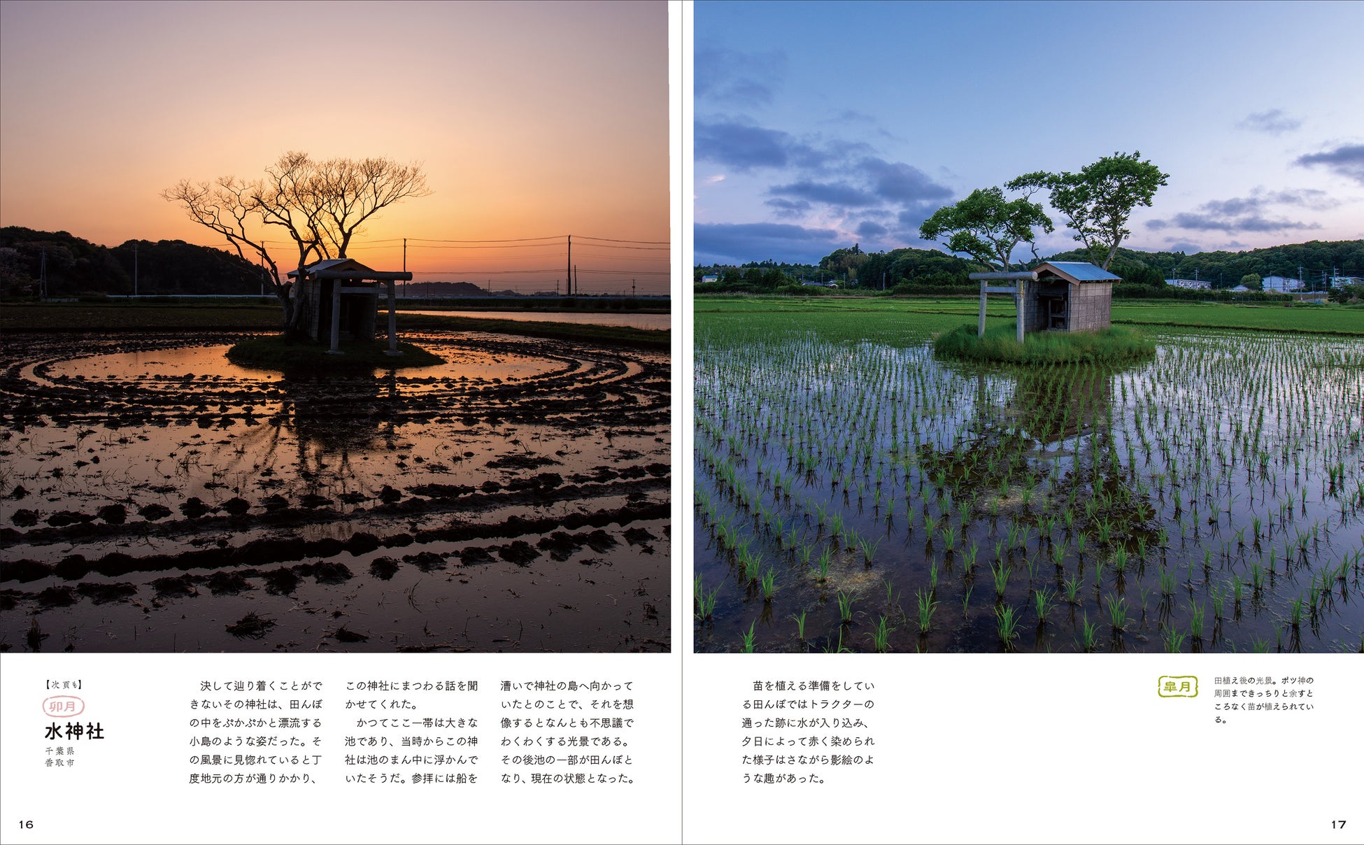このような神社との出会いは思いがけないものだった。日本中の不思議な風景に惹かれて旅をしている私が、旅の道中に偶然見つけ立ち寄ったひとつのポツンと神社。季節は春、時刻は夕暮れ時。ゆったりとした静かな時間の中で、そよ風が優しく頰を撫でる。田植え前の水田に夕焼けの茜色が反射し、鳥居のシルエットもまた水面にぼんやりと浮かび上がっていて──。