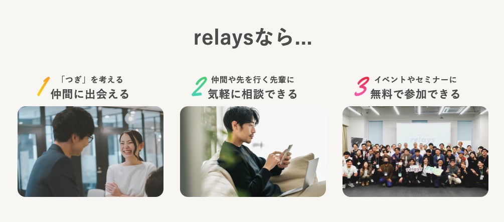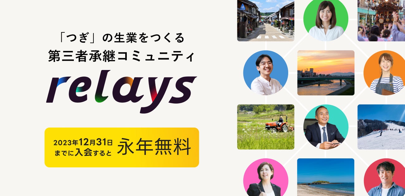 本日公開された特設ページでは、relaysの特徴や、relaysで生まれるポジティブなサイクルについて紹介しており、今後は第三者承継経験者からのメッセージも掲載予定です。2023年12月31日(日)までの期間にrelaysへ入会申込みされた方は、メンバーシップ永年無料となっています。