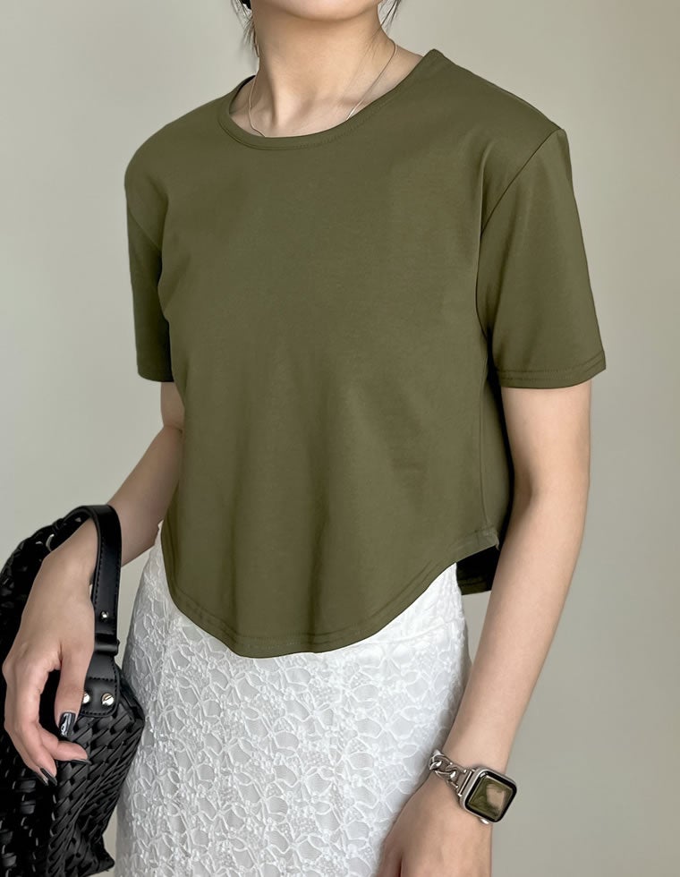 モードなラウンドヘムで、今年らしい着こなしが叶うコンパクトTです。