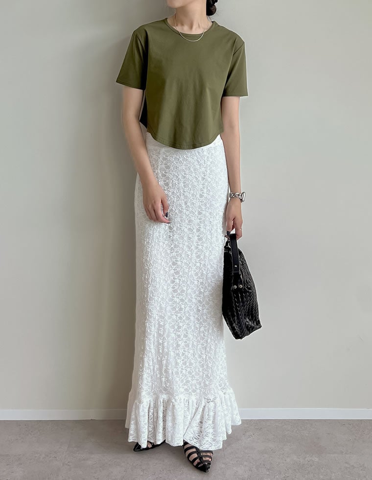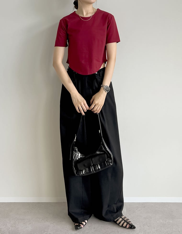 ボトムはローウエストのパンツを合わせたり、肌見せを控えたいときはハイウエストボトムでも相性抜群。