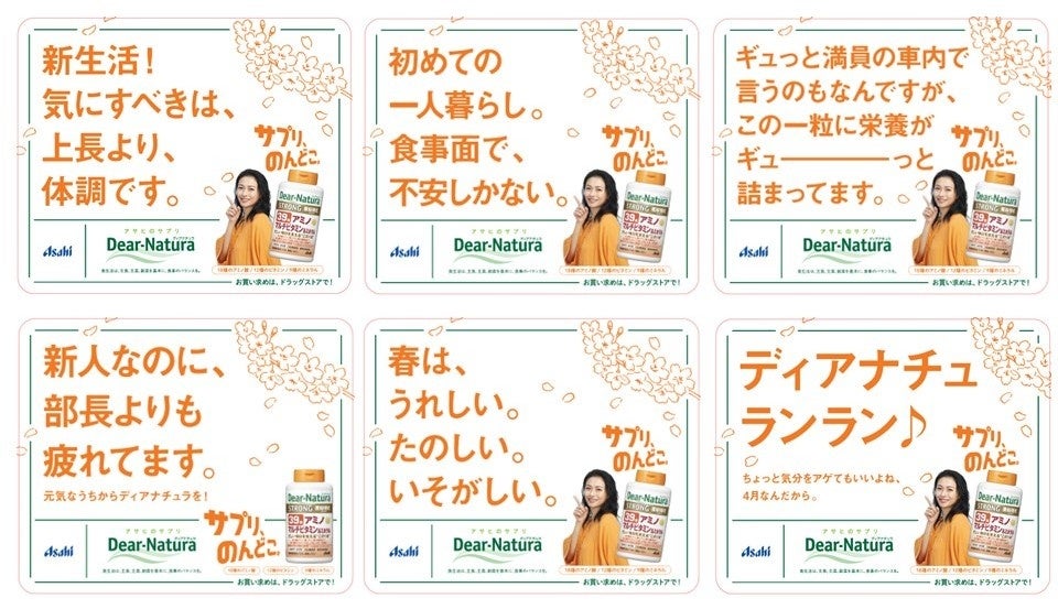 4月7日より、新しいコミュニケーション「サプリ、のんどこ。」をキーメッセージに掲げ、関東・関西・名古屋・札幌・仙台・広島・博多の7都市の主要駅構内で、『ディアナチュラ ストロング39アミノ マルチビタミン&ミネラル』を訴求する広告を展開します。さらに、東京と大阪では6種類のドアステッカーを展開し、忙しい新生活を送る方々の栄養バランスを応援します。