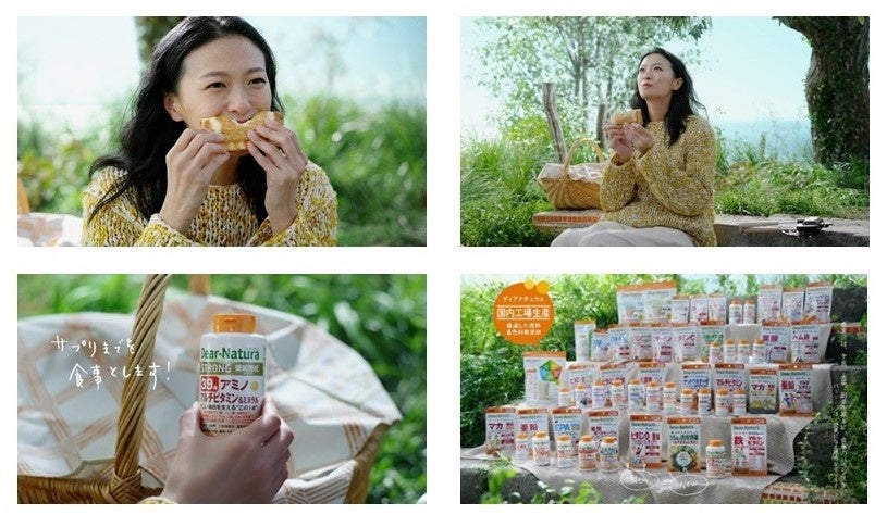 気持ちが良い青空の下で自由な時間を愉しみながらホットサンドを頬張る榮倉さん。ふと栄養バランスが気になり、多様なラインアップの「ディアナチュラ」から『ディアナチュラ ストロング39アミノ マルチビタミン&ミネラル』を選び口にする様子を、「サプリまでを食事とします!」のメッセージと共に、食事を楽しみながらも栄養バランスの大切さを表現しています。