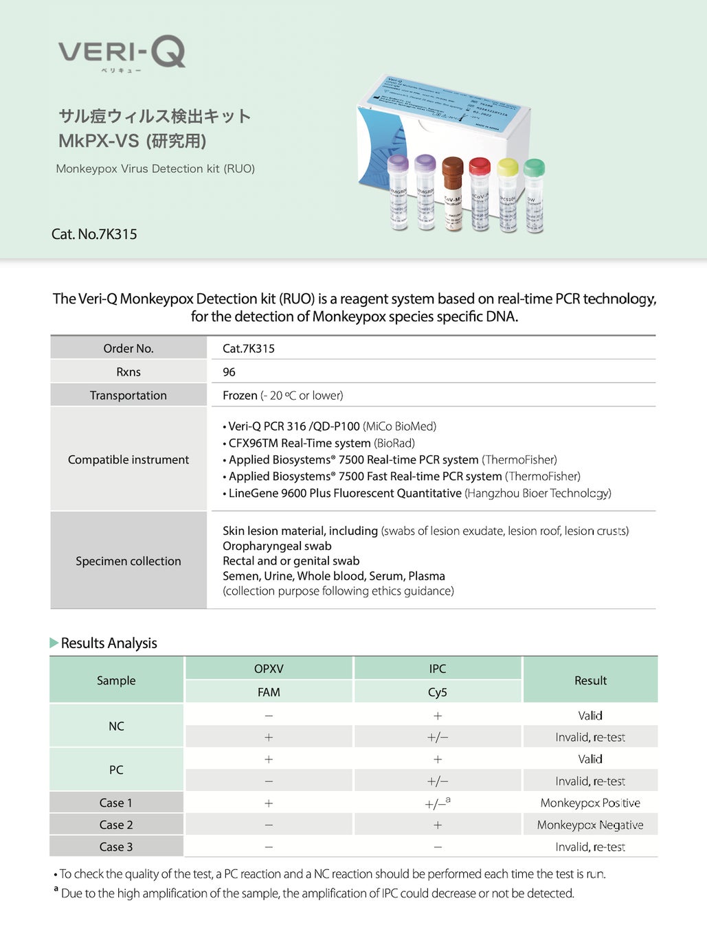 株式会社はMiCo BioMed Japanは、MiCo BioMed社製のVERI-Q MkPX-VS サル痘ウイルス検出キット(研究用)の発売しました、今後感染拡大が懸念される感染症の対策設備です