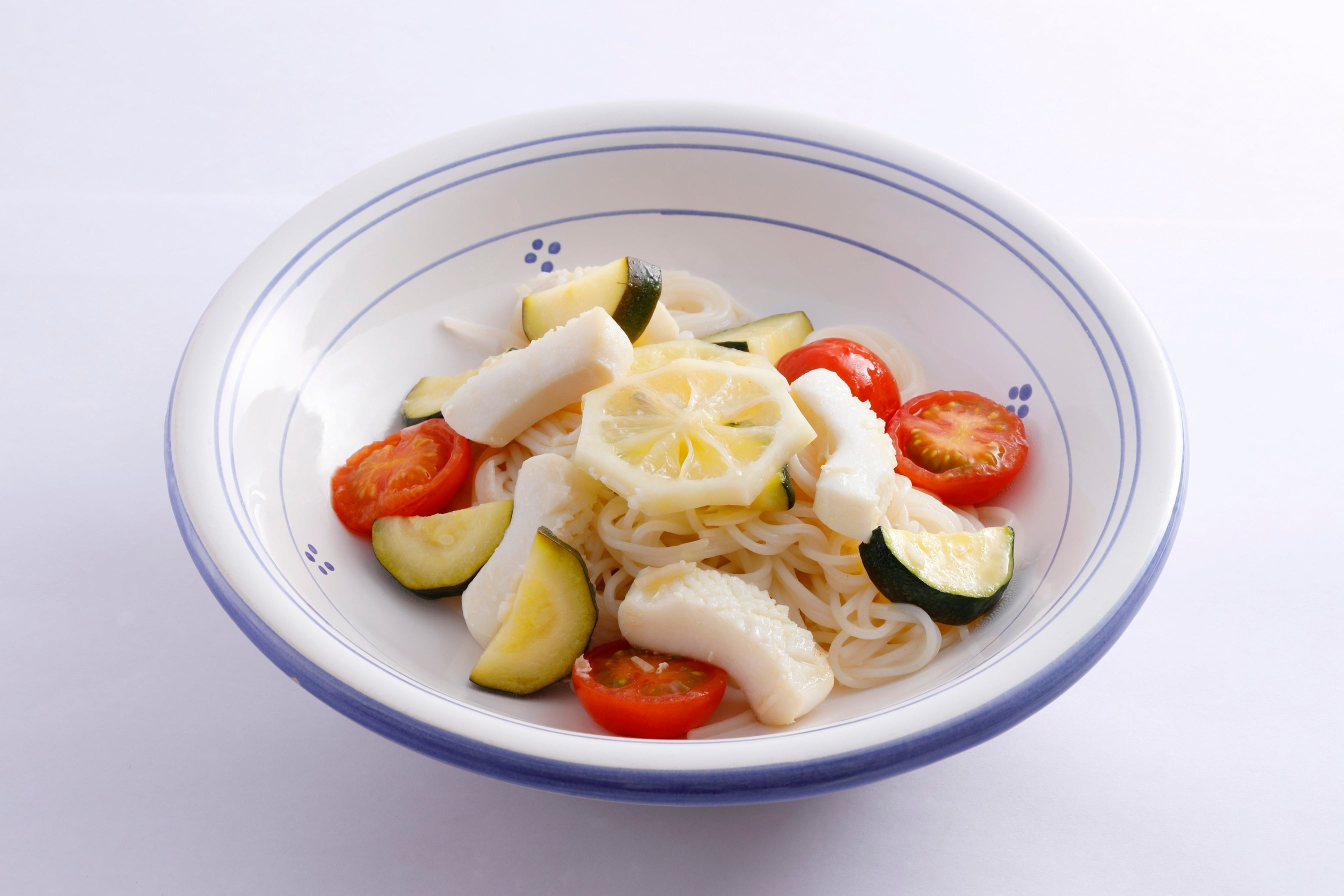 夏らしくレモンを使ってさっぱり食べていただけるパスタに仕上げます。ライスパスタのもちもち感がたまりません。