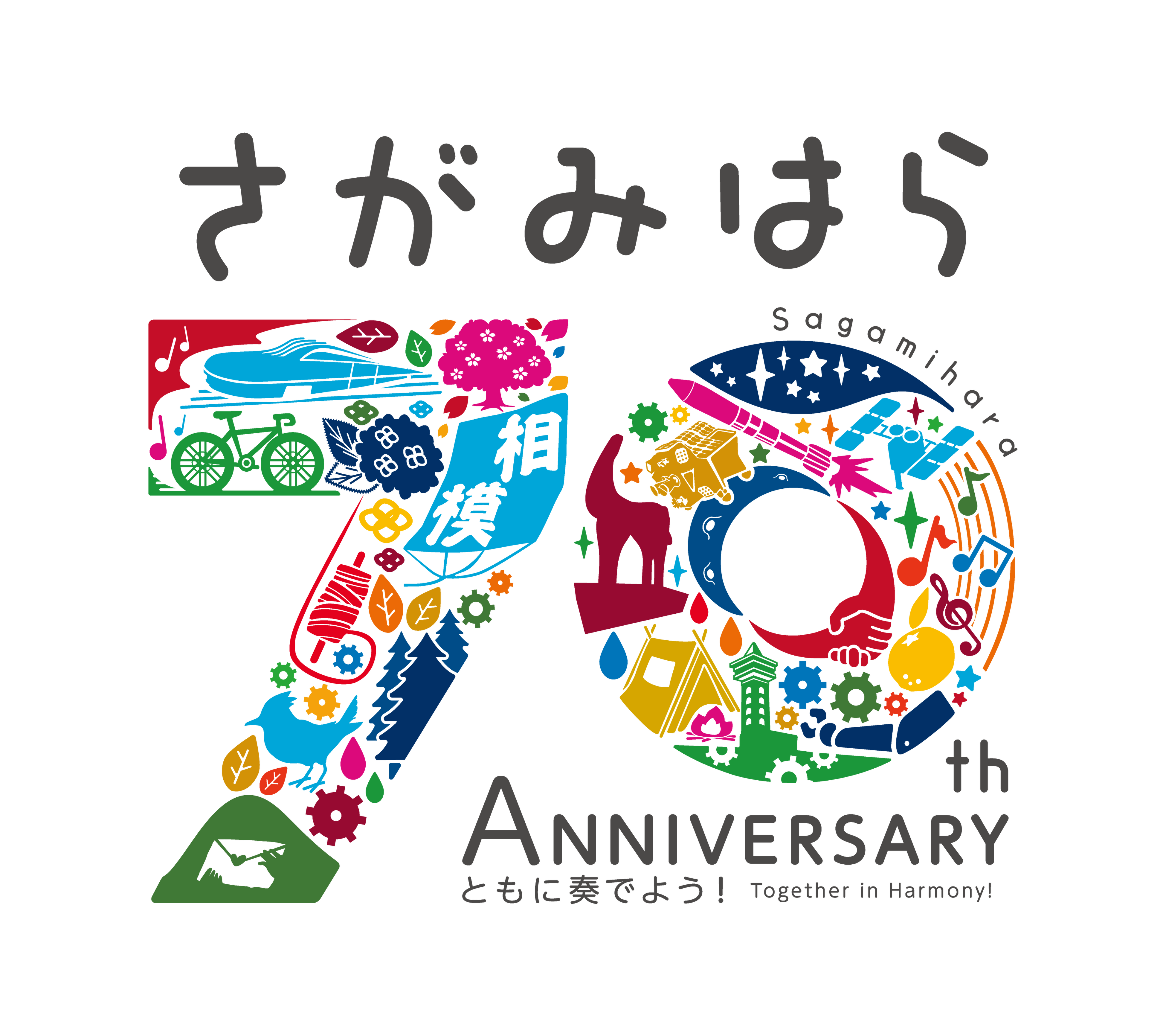 相模原の市制70年の歩みを「70」の文字に詰め込むことで、先人から受け継いできた相模原の歴史と、自然、宇宙、生き物、産業が繋がり、人と人が手を取り合って発展してきた様子を表現しています。