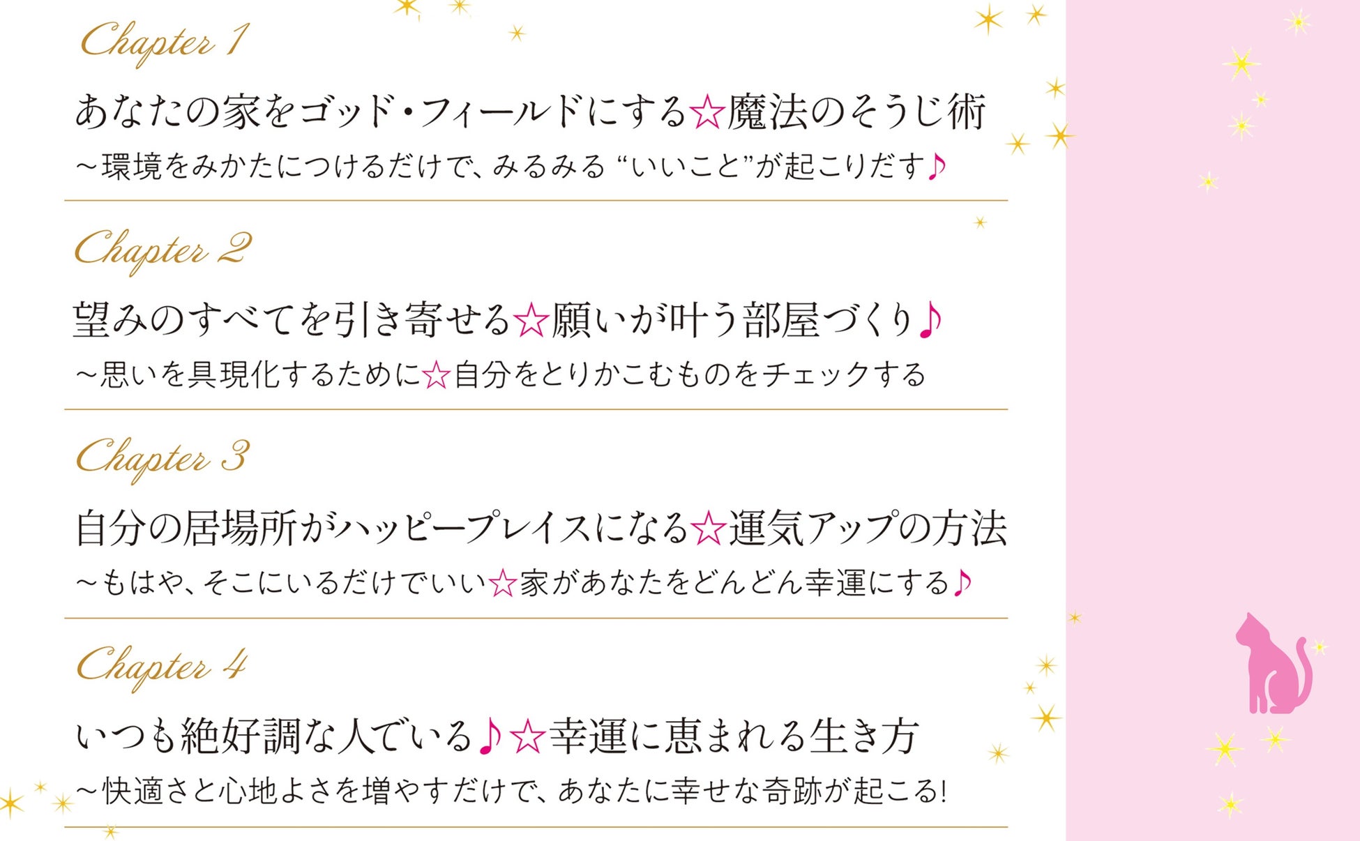 本書は、引き寄せの磁力が働くお部屋づくり・あらゆる魔を消す魔法の拭き掃除・病気や不調のもとである瘴気を追い出す方法や、各部屋の波動の整え方など、あなたの家のお部屋をまるごと“いいことだらけ”にし、運を大きく底上げする方法を満載した一冊です。