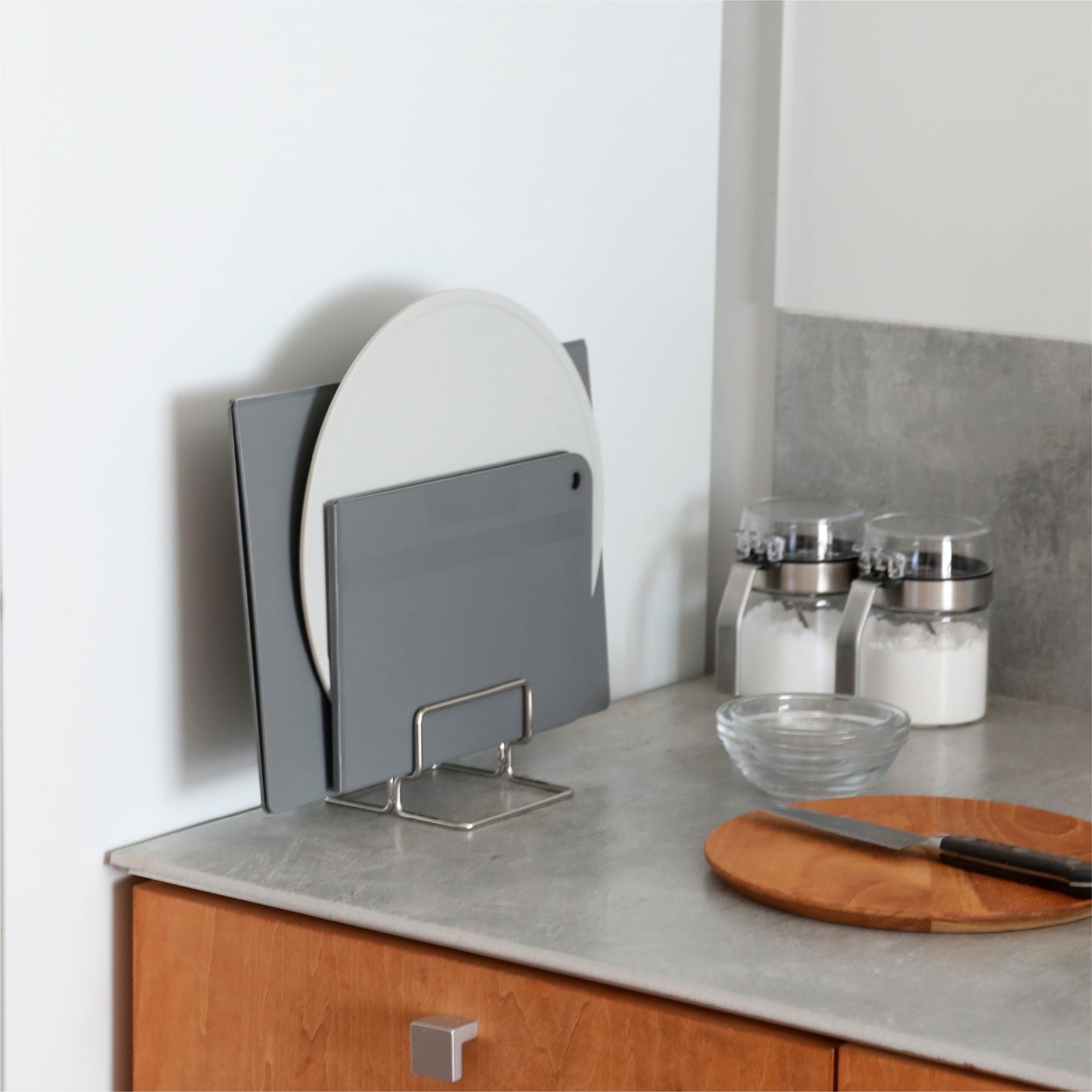 正方形・長方形・丸型など、あらゆる形のまな板を立てて収納できるスタンドで、キッチンの“置き場所問題”を解決します。